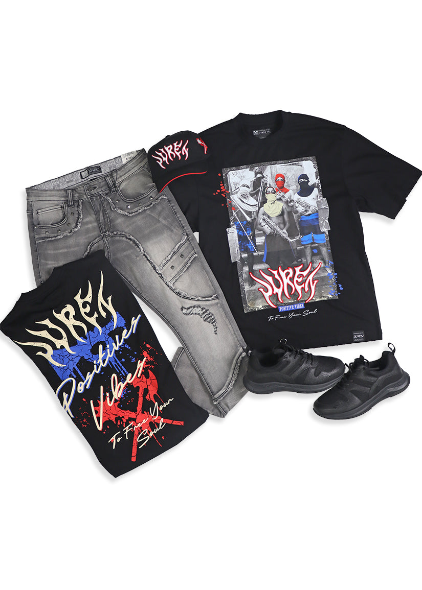 Releasing Positive Vibes Black, Grey Denim Jeans and Trucker Hat Combo (Shoes Not Included)