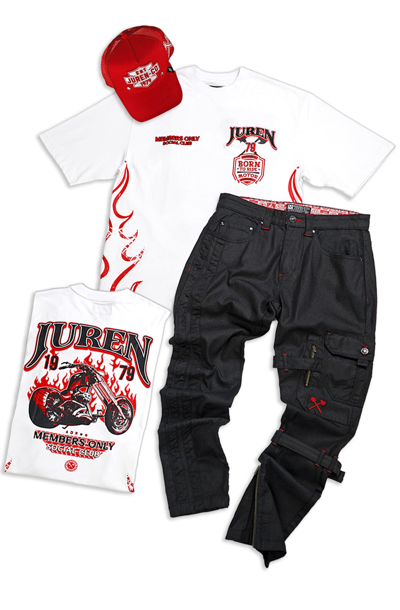 Members Only White Tee, Cement Jeans and Red Trucker Hat Combo Include: