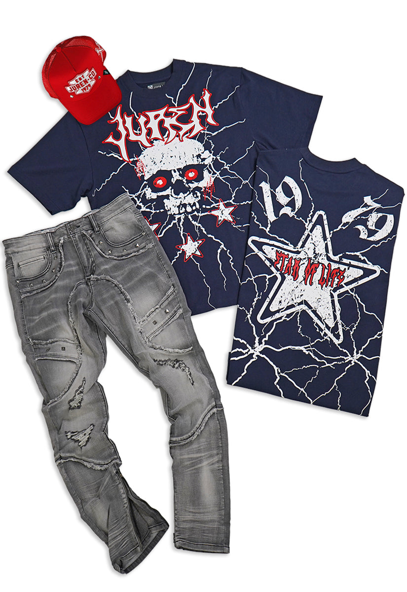 Star Of Life Navy Tee, Juren Jayvon Gray Wash Denim Jeans and Red Trucker Hat Combo Include: