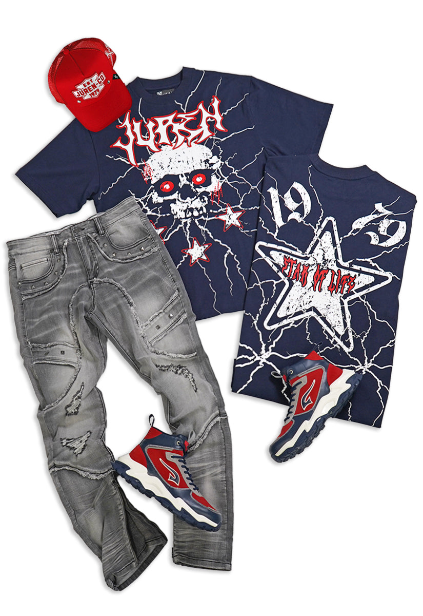 Star Of Life Navy Tee, Juren Jayvon Gray Wash Denim Jeans, Red Trucker Hat and Sneakers Combo Include: