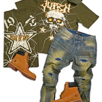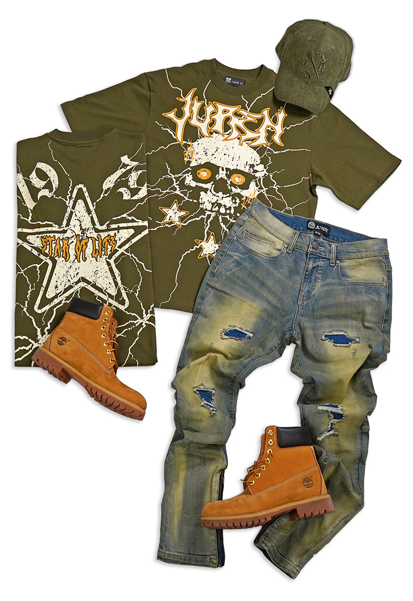 Star Of Life Olive Tee, Blue Viscose Wash Denim Jean  and Olive Corduroy Trucker Hat Combo Include: