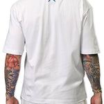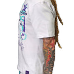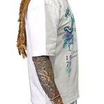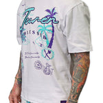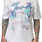 Discover your inner peace and style with the Coastal Courier Tee. This white heavy cotton t-shirt with a teal and purple palm tree oasis design features slightly torn edges and an embroidered Juren script name with "Blessed" underneath. The phrase "To find yourself, think for yourself," adds authenticity to this statement piece. Plus, the edgy embroidered battle club and axe design on the back solidifies this as a must-have for any brand enthusiast.