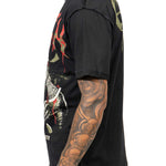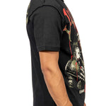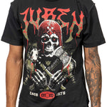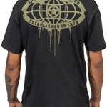 The Death Before Dishonor Distressed Tee features a bold, edgy design. This black tee showcases distressed holes for a rugged look, with an oversized front print of “Juren” alongside a medieval skeleton wielding an axe and mace in olive and red. The back displays a striking "Juren Clothing Co." globe graphic, dripping in olive, making this tee a standout piece for anyone who values style and attitude.