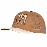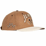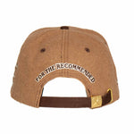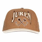 This khaki wool Juren hat features "Juren" embroidered in cream with khaki and brown outlines, paired with the signature axe and mace logo below. With a cream vegan leather visor, "Dominate Your Destiny" embroidered on the side, and "For the Recommended" on the back, it's finished with a golden clasp for a bold look.
