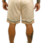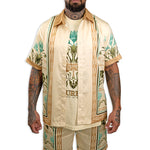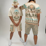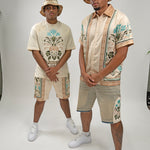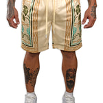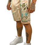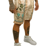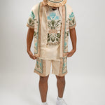 Elevate your wardrobe with the Elegant Arrangement Shorts, crafted from luxurious cream silk for a smooth, comfortable feel. These shorts feature an elastic waistband with adjustable drawstrings, ensuring a perfect fit for all-day wear. Adorned with intricate floral arrangements and a distinctive Greek border along the front and hem, they blend classic artistry with modern design. Ideal for those seeking both style and comfort, these shorts offer a refined look suitable for casual outings or sophisticated lounging. Experience elegance and ease in one versatile piece.