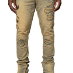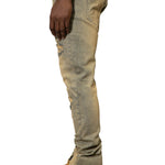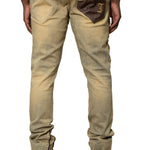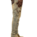 These Juren jeans bring rugged style with a vintage wash, distressed details revealing khaki ribbing underneath, and a flare zipper option. The right side features a double axe and mace logo in brown vegan leather with wheat embroidery, adding a bold finish.