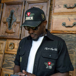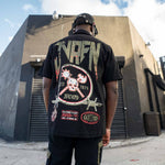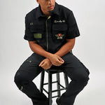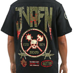 The Honor & Glory Button Up combines military edge with detailed craftsmanship. This black shirt features olive ribbing and multiple embroidered patches on the front in olive, cream, and red. The back makes a statement with an oversized "Juren" print, a skull and barbed wire logo, and signature Juren icons, creating a bold look that stands out from all angles.