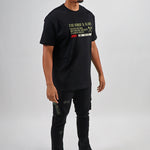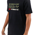 The Honor & Glory Distressed Tee brings a rugged, statement-making vibe. This black tee features distressed holes throughout, with embroidered text on the front that reads, “For Honor & Glory, created for those who push past adversity to achieve success. Juren - Recommended only,” in olive, red, and cream. A Juren logo patch accents the bottom hem. On the back, an oversized print showcases "Juren Clothing Co." with a skull in a military helmet, crossed axe and mace, and flames, circled by dripping red text that reads "Honor & Glory." Black Shirt