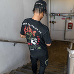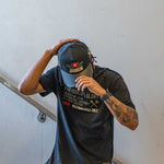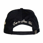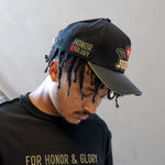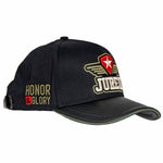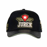This black, military-inspired trucker hat combines bold style and grit. The front showcases “Juren” in 3D cream, olive, and red embroidery, paired with a black vegan pebble leather visor with olive ribbing. "Honor and Glory" is embroidered on the right, the Juren logo on the left, and “Try to Stop Us” in cursive cream embroidery completes the back—a statement piece for those who strive for greatness