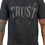 Trust No One" Black Tee features a captivating gel print of the word "Trust" embroidered boldly across the chest, adding intrigue to your style. Crafted for those who navigate life with caution, this tee ensures comfort and durability for your everyday adventures. Embrace the mystery and command attention wherever you go with our "Trust No One" Black Tee. 🖤🔒👕