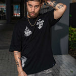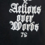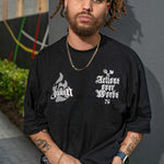 Make a bold statement with the Don't Trust Words Black Tee, where actions speak louder than words. The front features "Actions Over Words" embroidered prominently, paired with the Juren logo, emphasizing a commitment to authenticity and integrity. On the back, a full-size print captures the message "Don't Trust Words, Trust Actions," accompanied by two tattooed hands poised to shake, symbolizing the strength of true commitment and reliability. With its clean black base and impactful design, this tee is perfect for those who live by their actions and value substance over mere words.