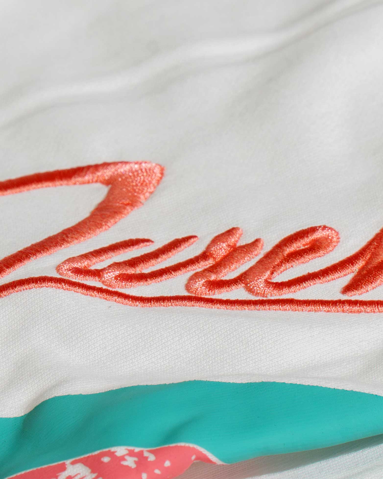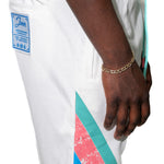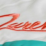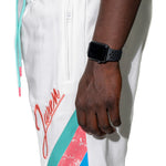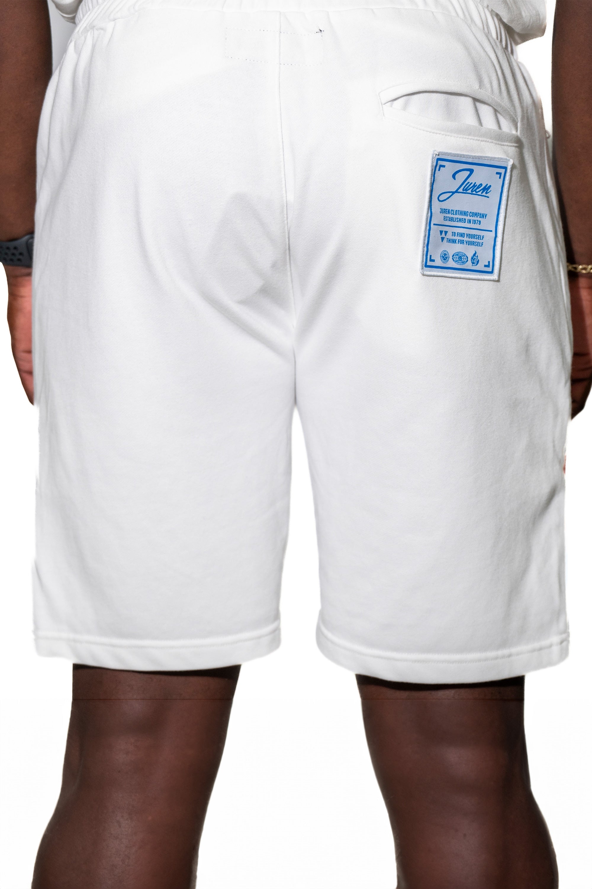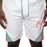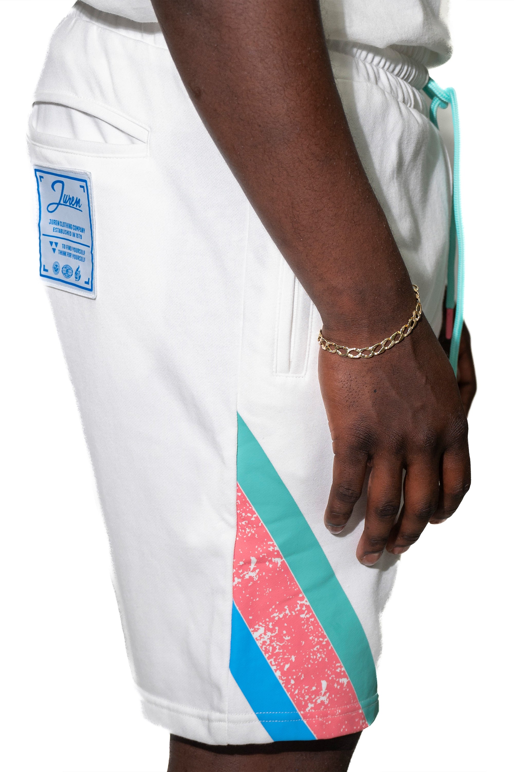 The Juren Epic Retreat Colorblock Knit Shorts bring a vacation vibe to your wardrobe. These white shorts feature a 3D embroidered "Juren" on the left side and vibrant colorblocks in aqua blue, coral, and seafoam green. The adjustable seafoam green drawstring with coral tips adds a stylish touch. Perfect for casual outings, these shorts offer both comfort and a splash of color for a laid-back, yet chic look.