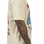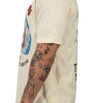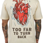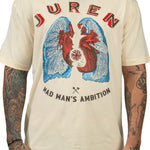 The Juren Mad Man's Ambition Cream Tee features a sophisticated front design with the Juren logo embroidered, showcasing intricate and detailed lungs in a gel print. A broken heart in the center symbolizes passion and determination, accompanied by the words "mad man's ambition." On the back, a jumbo print captures attention with a large heart and the empowering message "TOO FAR TO TURN BACK," embodying resilience and commitment. This tee blends artistic expression with motivational verbiage, making it a compelling addition to any wardrobe.