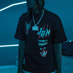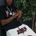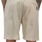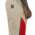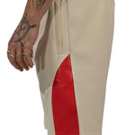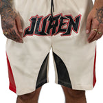 The Juren Positive Zone Shorts in cream feature black and red vegan leather cut and sew elements, offering a stylish and contemporary design. The front of the shorts showcases "JUREN" in a stylized font made of black vegan leather, accented with white and red embroidery. These shorts blend unique materials and bold branding, making them a standout addition to any streetwear wardrobe.