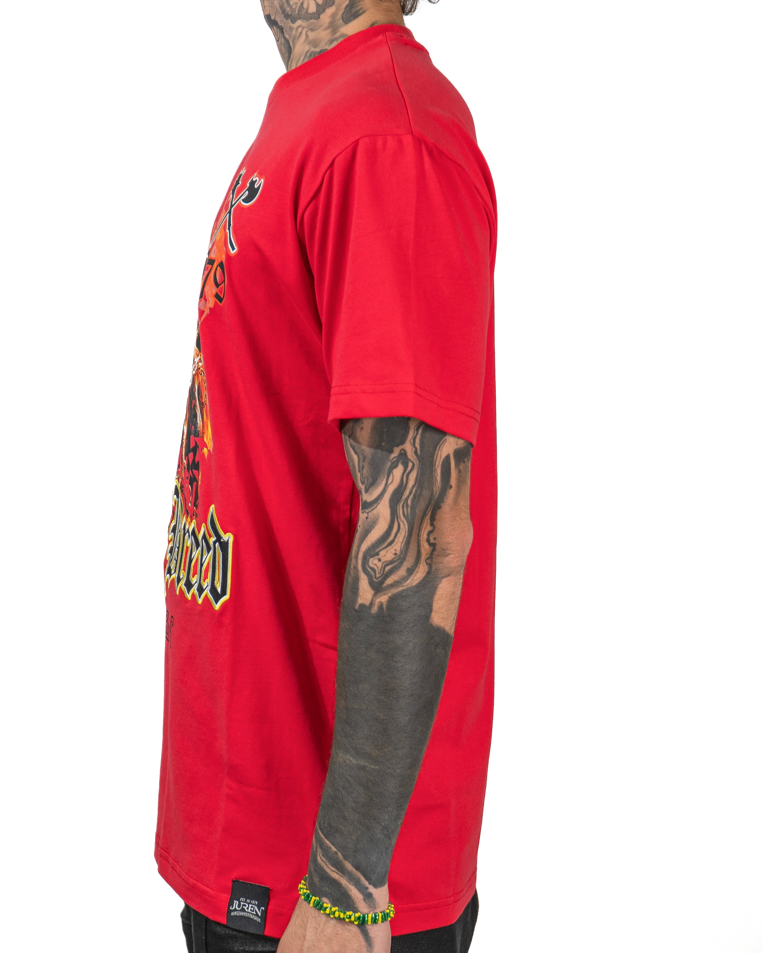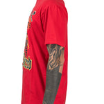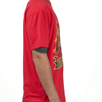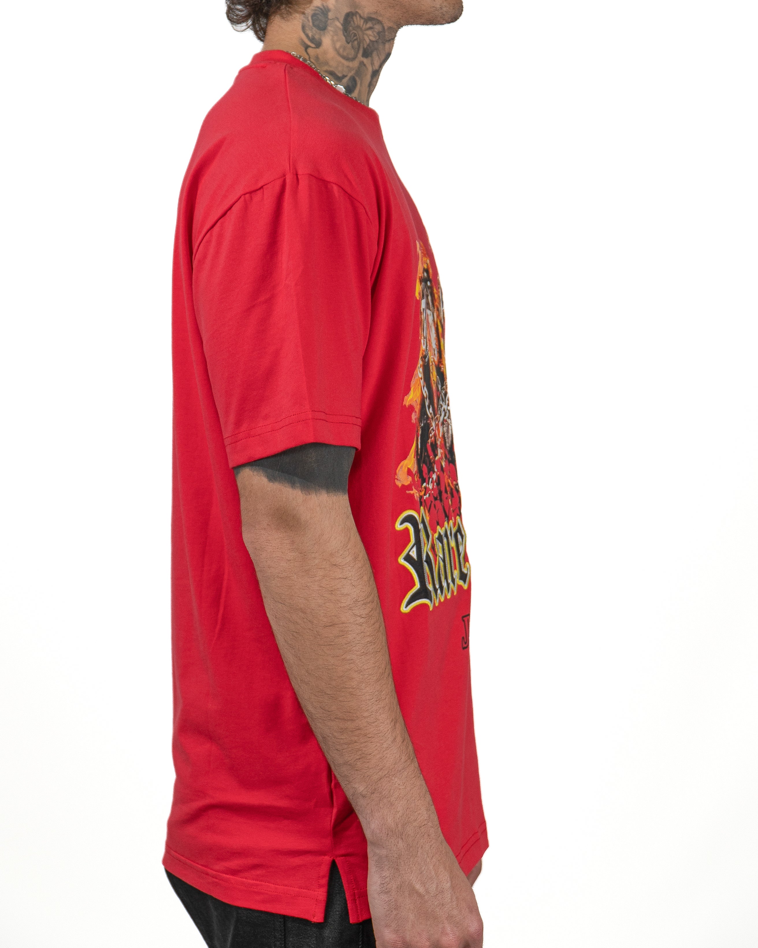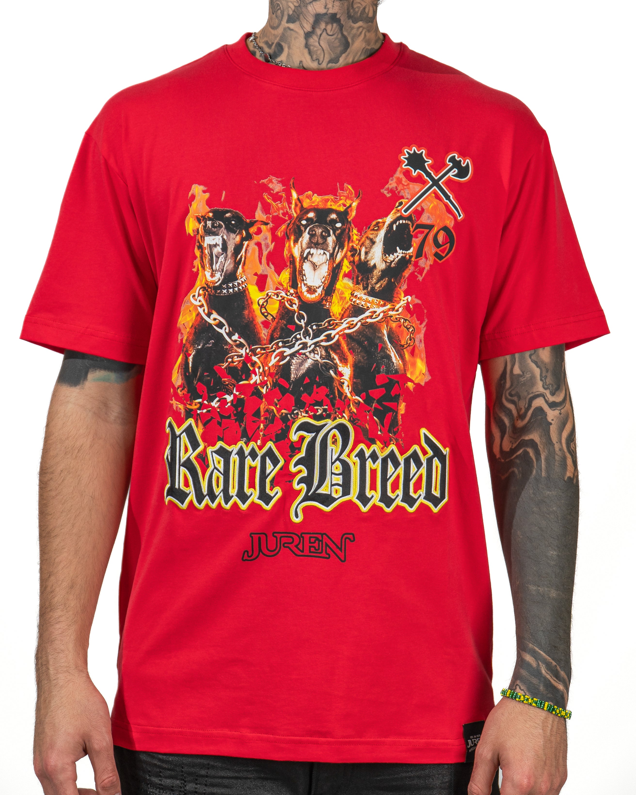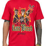 The Rare Breed Black Tee design features three majestic Dobermans, each with a distinct stance, chained together against a backdrop of fierce flames. The intensity of the fire contrasts starkly with the sleek black coats of the Dobermans, emphasizing their strength and resilience.