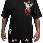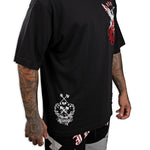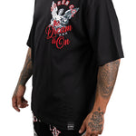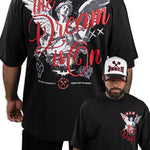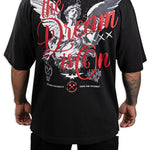 THE DREAM T-SHIRT is a striking black tee featuring a detailed angel embroidered in red on the left front side, accompanied by the phrase "THE DREAM IS ON." The back showcases an oversized gel print of the same angel and text, creating a bold visual statement. Crafted for those who appreciate both style and symbolism, this shirt combines intricate embroidery with durable gel printing to ensure lasting quality and standout appeal. Perfect for making a confident impression, it blends artistic design with comfortable wearability.