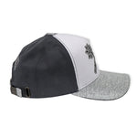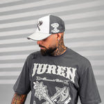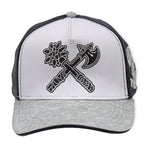Experience maximum comfort and style with the Tribe Trucker Hat. Designed with a heather grey visor, a white panel featuring embroidery of the Juren Battle Club and axe, and dark grey side and back panels, this hat is sure to make a statement. Use the heather grey closure with a clasp on the back to adjust for the perfect fit.