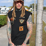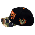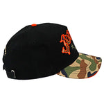 The right side hits with the “See No Evil” patch, while the visor and underbrim flex in full camo satin, trimmed with bright orange piping for a sharp, standout finish.