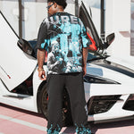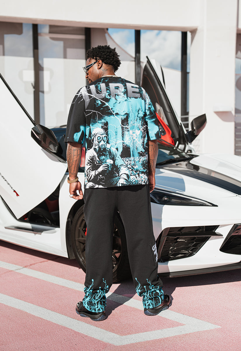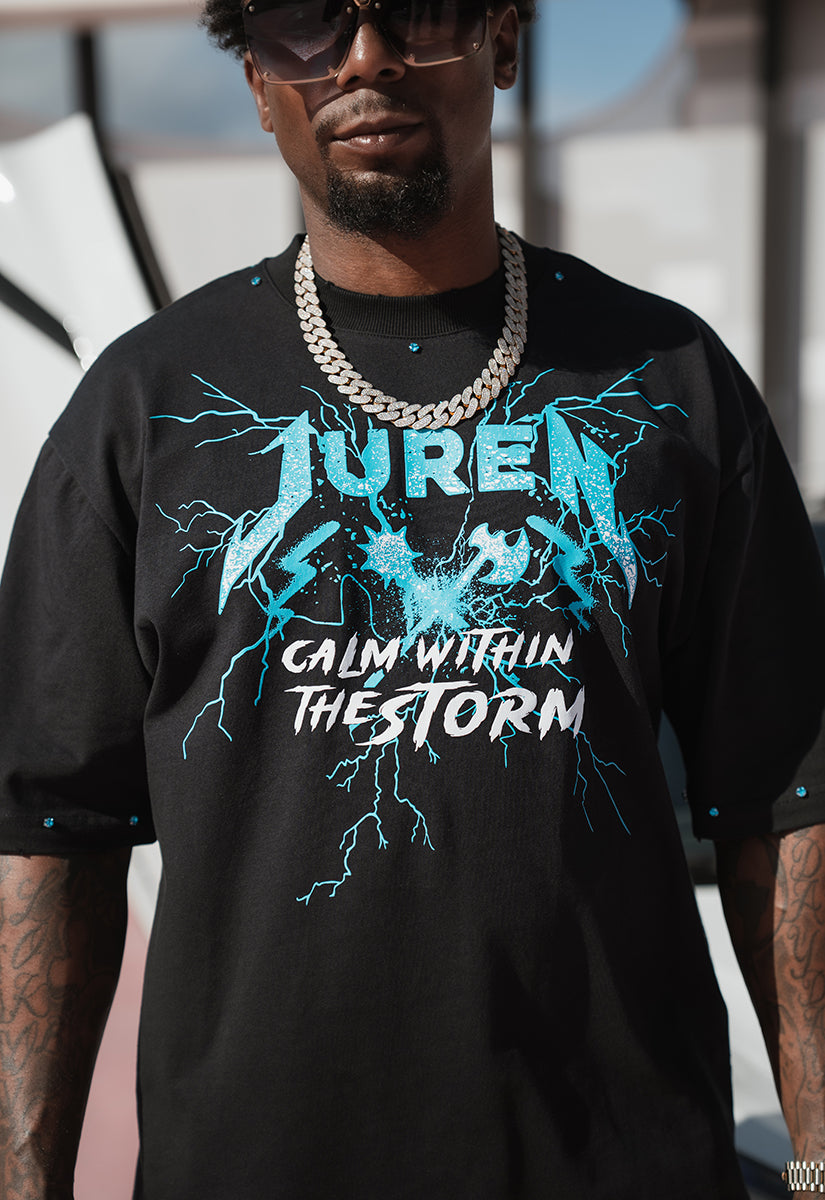 The CALM WITHIN THE STORM SHIRT represents a bold statement piece that merges contrasting imagery into a cohesive narrative. The front features the iconic Juren Lightning battle axe logo rendered in striking teal, accompanied by "Calm Within the Storm" in crisp white lettering—all executed in premium gel print for durability and visual impact. This design captures the essence of finding peace amid chaos, a philosophy reflected in every detail. The back elevates the design further with a large, commanding Juren logo in white, paired with a powerful scene: a soldier in a gas mask holding a delicate flower. This juxtaposition symbolizes resilience and humanity, suggesting strength tempered with compassion. The storm backdrop reinforces the shirt's thematic core, creating a multi-layered visual experience that resonates with those who appreciate meaningful, artistic apparel. Crafted for those who value both aesthetic depth and quality construction, this shirt serves as wearable art that sparks conversation while delivering everyday comfort and style. All Black Shirt with Teal & White Graphics.