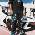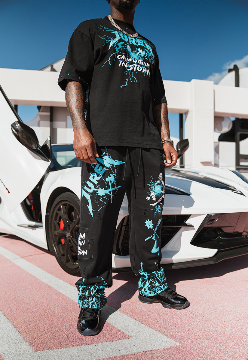 Embrace contradiction with the CALM WITHIN THE STORM SWEAT PANTS, where bold graphic storytelling meets everyday comfort. These all-black joggers feature an intricate teal design narrative: a masked soldier cradling a delicate flower, the Juren logo rendered in striking teal, and dynamic lightning bolts ascending from the hem. The phrase "Calm Within the Storm" appears in crisp white lettering, capturing the essence of finding peace amid chaos. Crafted for those who appreciate meaningful design, these sweatpants deliver both visual impact and wearable philosophy. The teal accents pop against the classic black base, creating a sophisticated aesthetic that works whether you're making a statement or simply living your truth. Perfect for anyone seeking apparel that reflects depth and individuality.