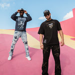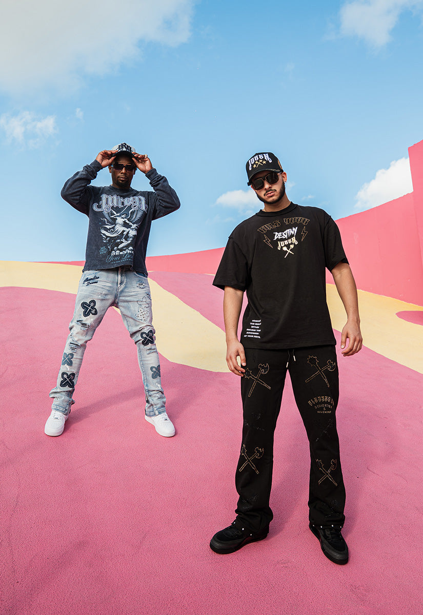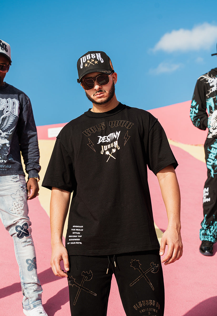 Command attention with the Rule Your Destiny Shirt, a premium all-black design that channels empowerment through sophisticated embellishment techniques. The front showcases "RULE YOUR" in striking gold rhinestones flanked by dynamic lightning bolts, creating an electrifying visual impact. Below, "DESTINY" appears in crisp white gel print, establishing bold contrast against the dark fabric. The Juren signature logo and battle axe emblem are rendered in lustrous gold foil, establishing brand identity with understated elegance. The back elevates the design further, featuring an enlarged version of the iconic logo and battle axe, crowned by a majestic gold foil crown that symbolizes dominion and authority. This expertly layered composition combines rhinestone brilliance, dimensional gel printing, and metallic foil accents to create a multi-textured masterpiece. Ideal for those who embrace a powerful mindset, this shirt seamlessly transitions from casual wear to statement pieces, making it a versatile addition to any wardrobe that celebrates personal strength and self-determination.