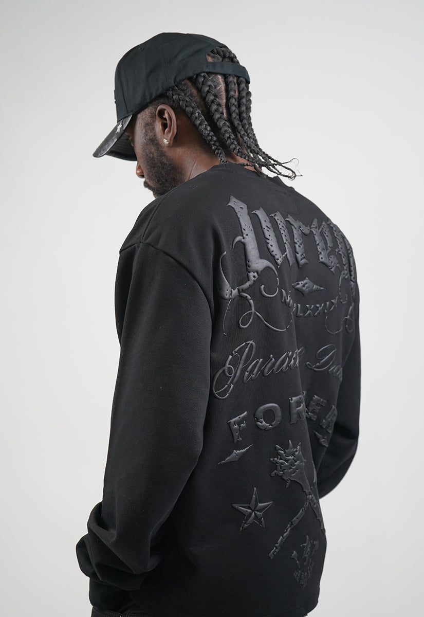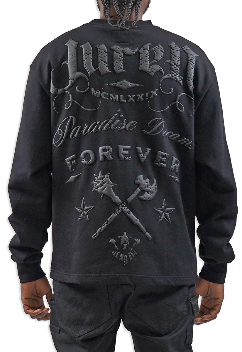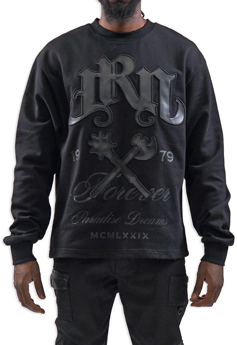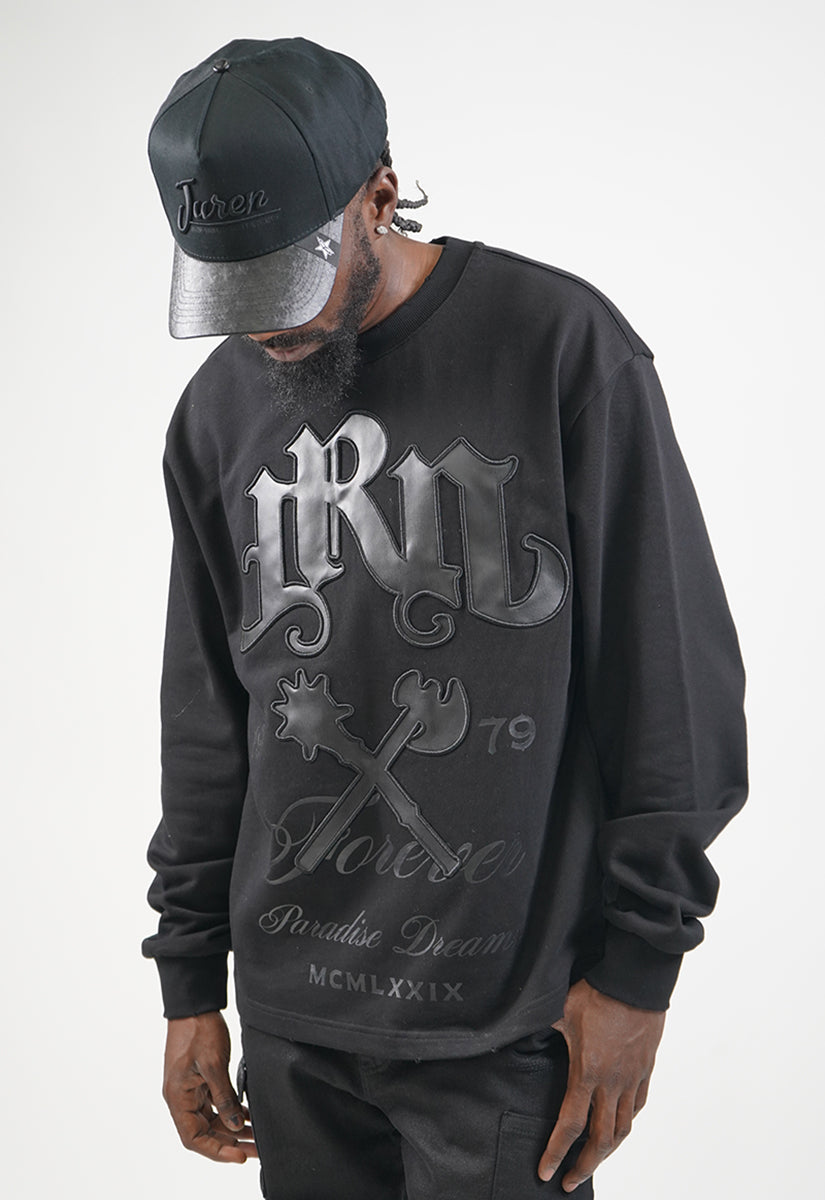 The JUREN FOREVER BLACK CREWNECK represents a bold statement piece designed for those who embrace authentic streetwear culture. This all-black crewneck features the iconic JRN Battle Axe Forever logo rendered in premium leather on both the front and back, creating a striking visual contrast against the fabric. The centerpiece showcases an expertly executed gel puff print of the JUREN logo, complemented by the "Paradise Dream" and "Battle Axe Forever" text positioned beneath. The combination of leather detailing and dimensional gel puff printing demonstrates meticulous craftsmanship, while the dual-placement branding ensures visibility and impact from every angle. Perfect for layering or wearing as a standalone piece, this crewneck delivers the distinctive aesthetic that defines the JUREN brand identity.