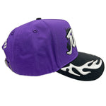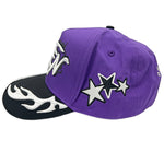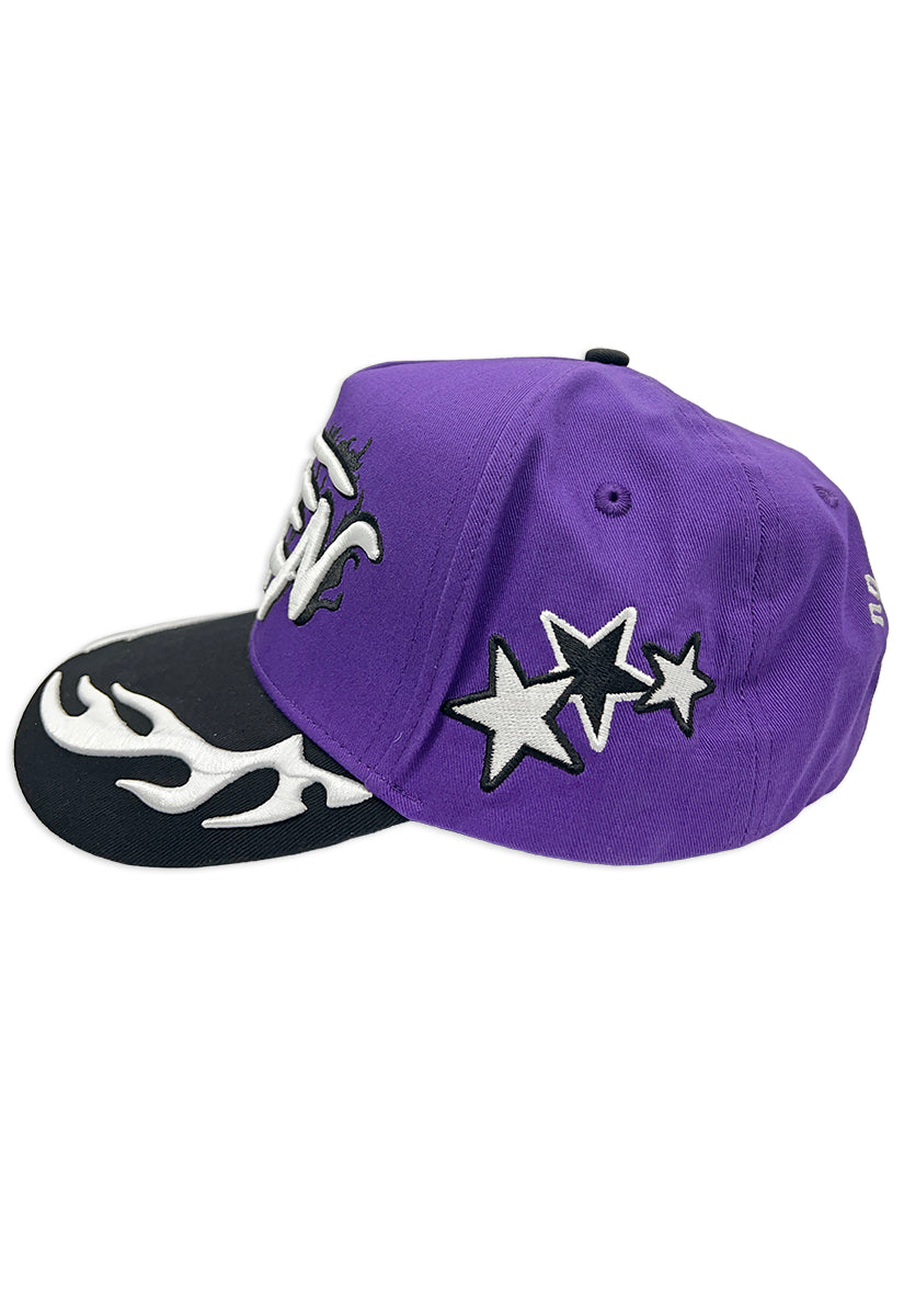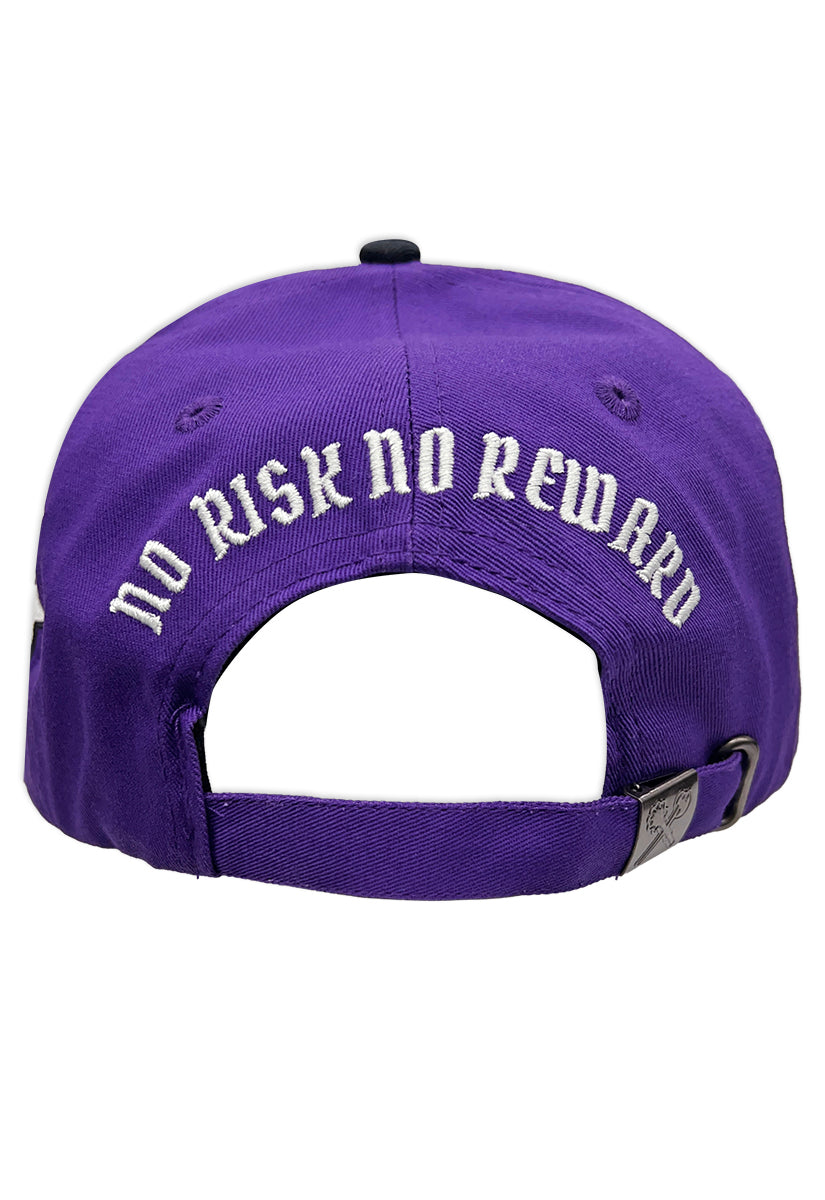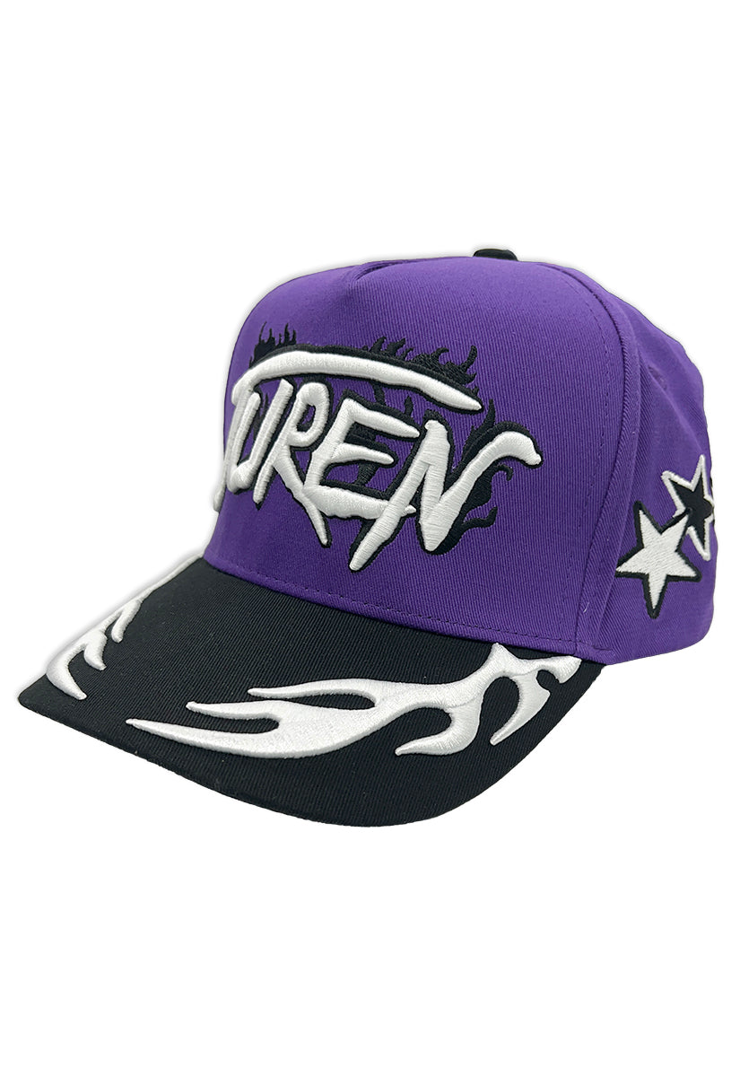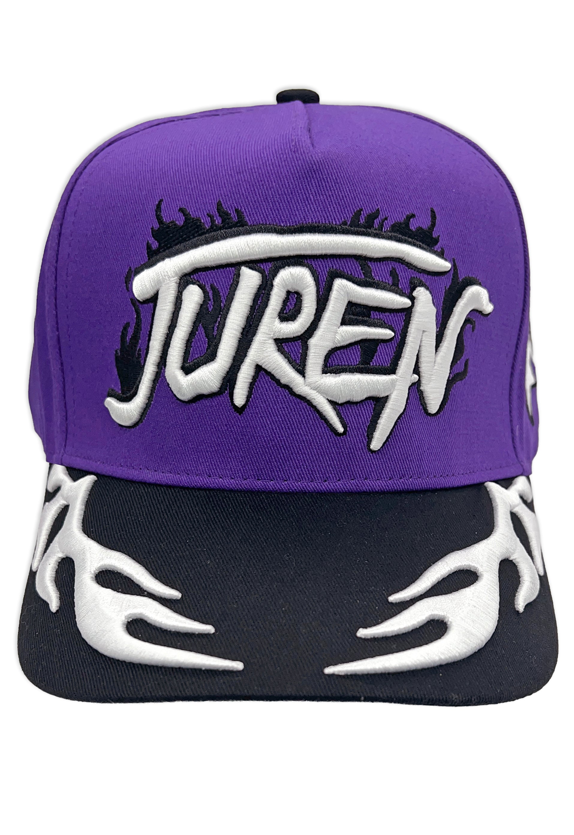 The No Risk No Reward Purple Trucker Hat combines bold style with expert craftsmanship. Featuring a vibrant purple crown contrasted by a sleek black rim, this hat commands attention. The front showcases the iconic Juren logo and twin flame motifs, both rendered in detailed white puff embroidery for a textured, standout effect. Designed for both comfort and durability, the breathable mesh back offers ventilation, making it perfect for extended wear. Whether you're out for casual days or making a statement, this hat merges striking aesthetics with practical design, embodying the spirit of taking risks for greater rewards.