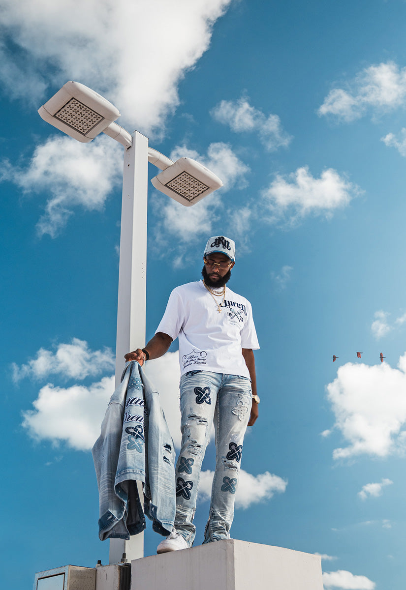 The Paradise Dreams Denim Jacket represents a sophisticated fusion of classic workwear and contemporary streetwear aesthetics. Crafted from premium blue denim, this jacket features distinctive Juren Battle Axe patches that establish its bold visual identity. The design showcases meticulous embroidery work, including a cursive "J" positioned on the collar for subtle branding and an expansive "Paradise Dreams" script rendered in navy across the back panel. This strategic placement of embroidered elements creates visual depth and movement while maintaining the jacket's refined silhouette. The combination of patch detailing and embroidery demonstrates attention to craftsmanship, making this piece suitable for those seeking statement outerwear that balances edgy design elements with polished execution. Ideal for layering across seasons, the Paradise Dreams Denim Jacket serves as a versatile foundation piece for contemporary wardrobes.