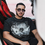 Stairway To Heaven Shirt features a striking black acid wash design that captures bold artistic vision. The front showcases an angular figure wielding the iconic Juren battle axe and battle bulb, creating a dynamic visual statement. The JUREN logo appears prominently across the chest in large capital letters, embellished with black and white rhinestones for added dimension and sophistication. Rhinestone detailing adorns the collar and sleeves, while the back features the JUREN name outlined entirely in rhinestones, ensuring eye-catching appeal from every angle. This shirt combines edgy aesthetics with premium embellishment, making it a standout piece for those who appreciate distinctive, statement-making apparel.