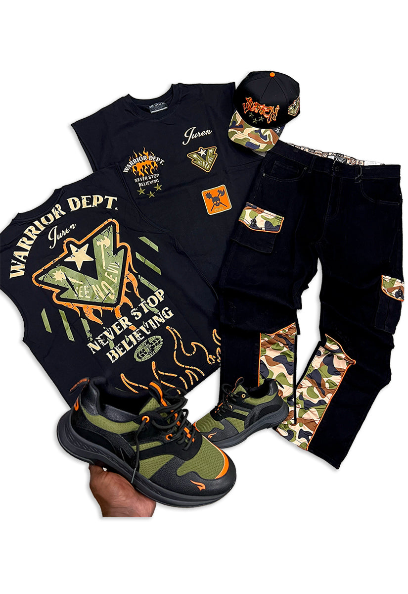 Warrior Dept. Muscle Tee Selected, Warrior Dept. Twill Pants, Sneakers and Trucker Hat Combo