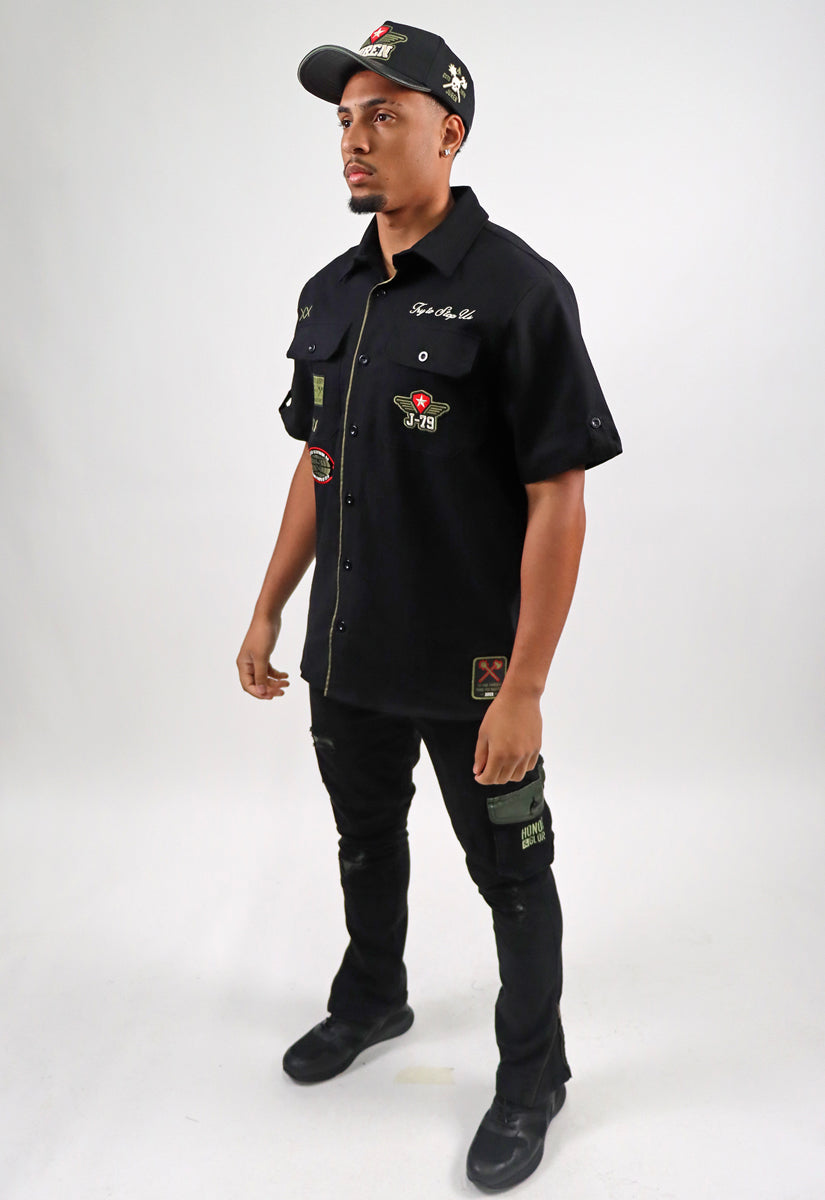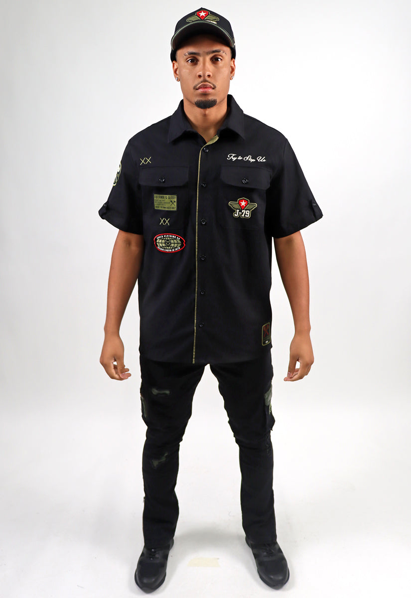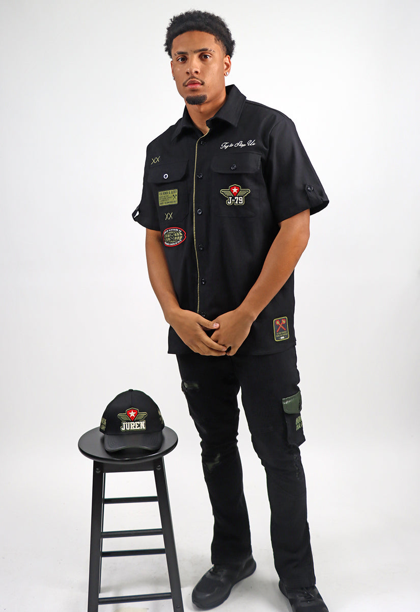 Honor & Glory Button Up Shirt, Distressed Tee, Denim Jean and Trucker Hat Combo Include: