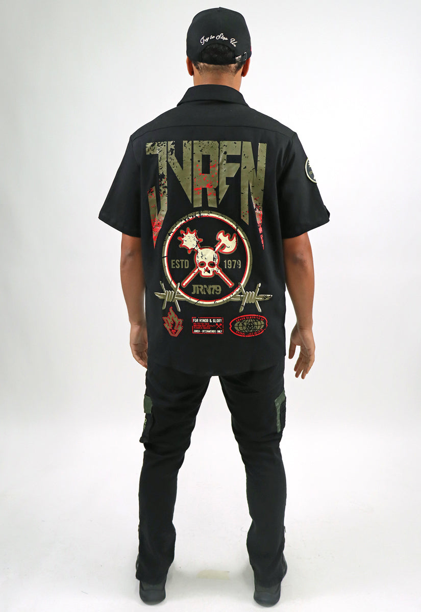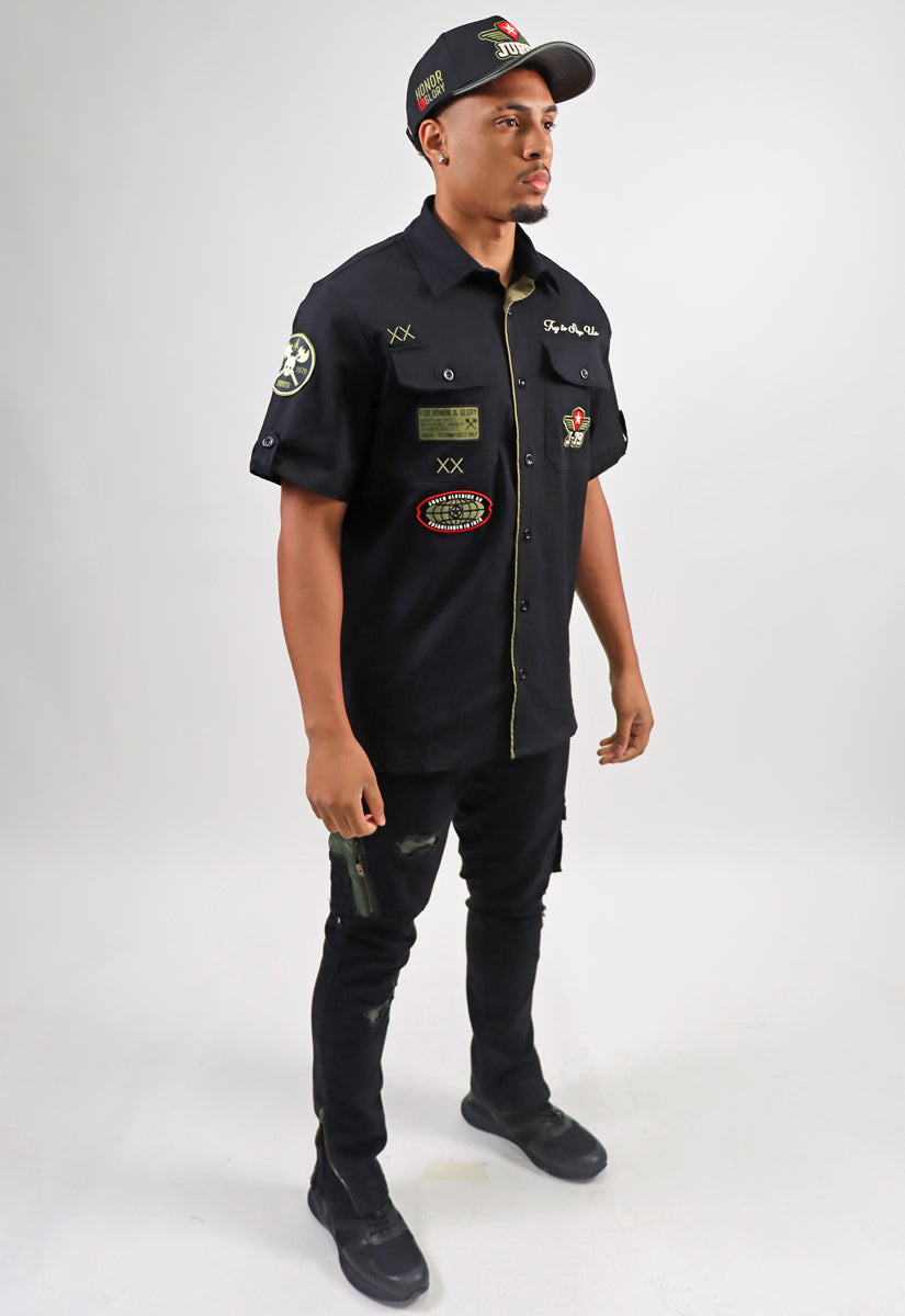 Honor & Glory Button Up Shirt, Distressed Tee, Denim Jean and Trucker Hat Combo