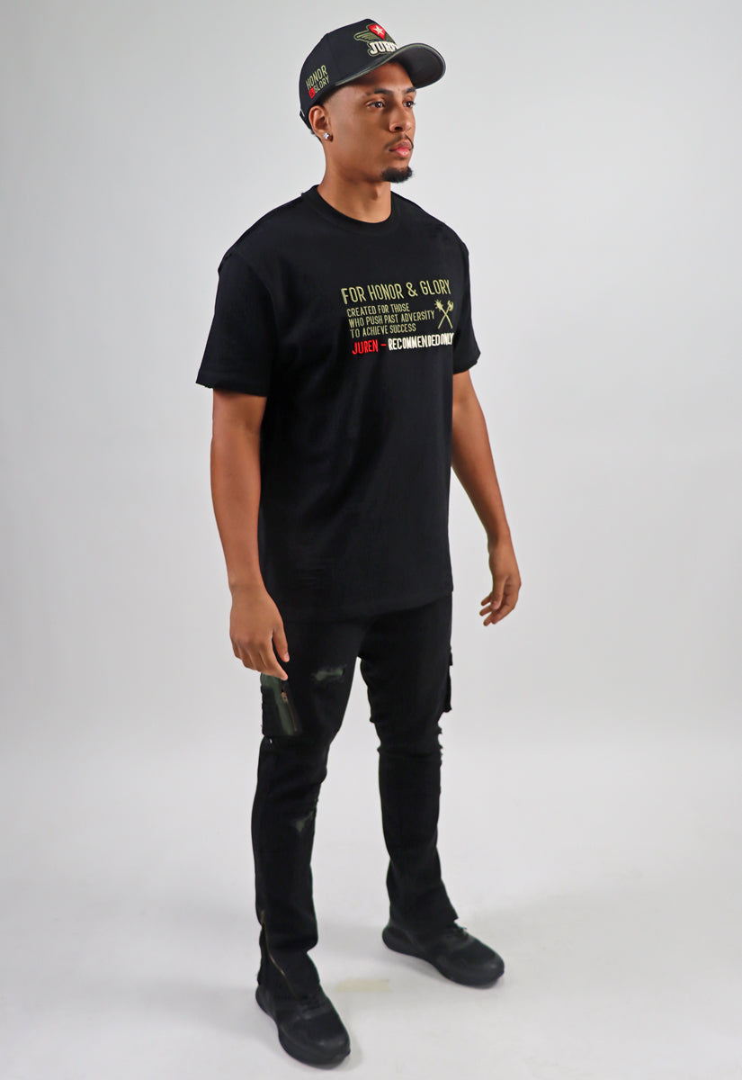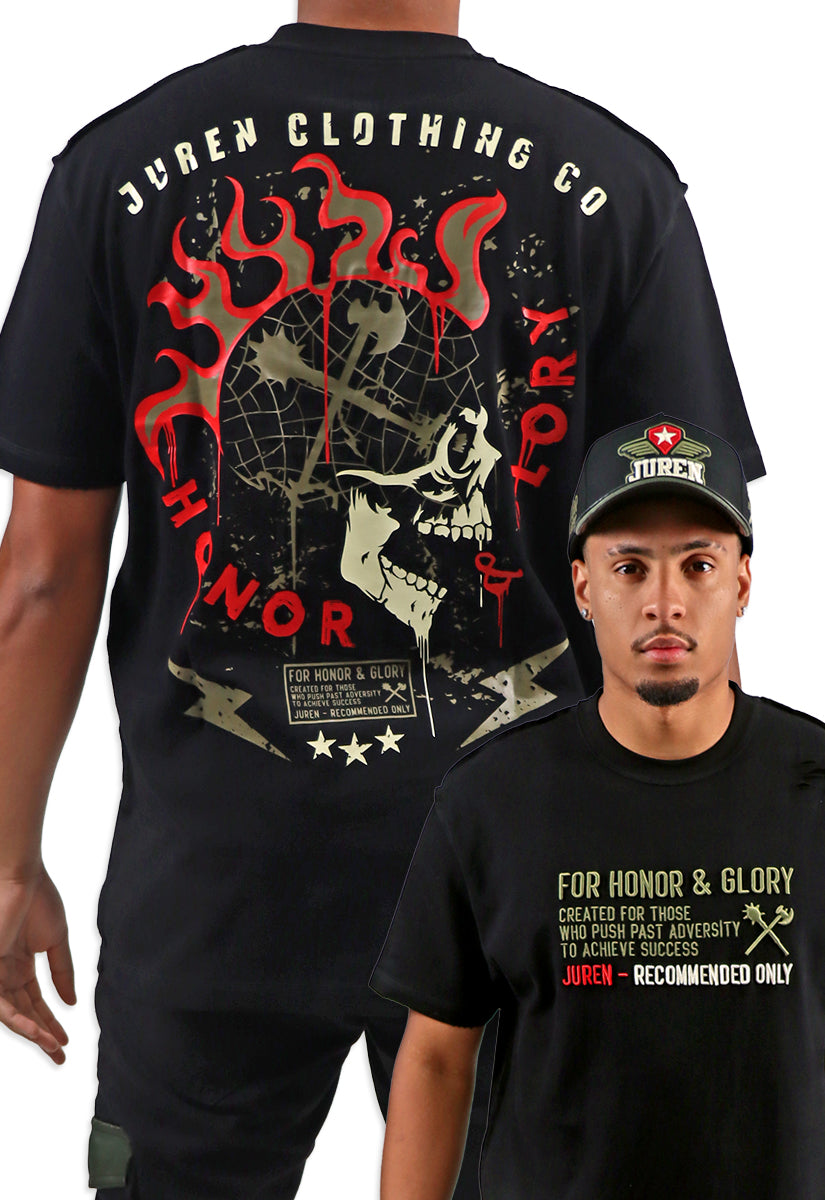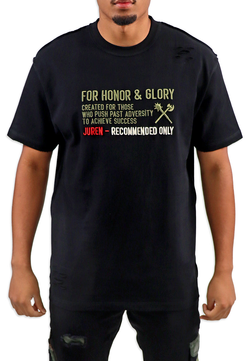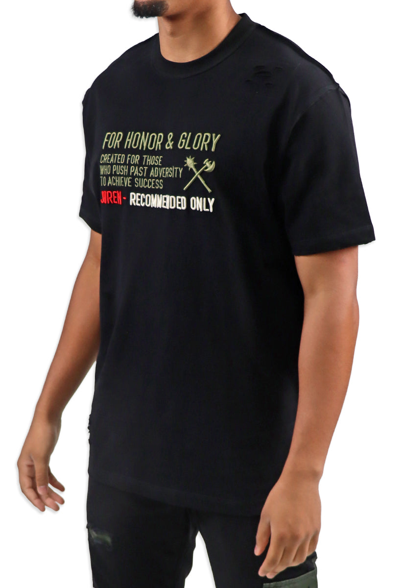 The Honor & Glory Distressed Tee brings a rugged, statement-making vibe. This black tee features distressed holes throughout, with embroidered text on the front that reads, “For Honor & Glory, created for those who push past adversity to achieve success. Juren - Recommended only,” in olive, red, and cream. A Juren logo patch accents the bottom hem. On the back, an oversized print showcases "Juren Clothing Co." with a skull in a military helmet, crossed axe and mace, and flames, circled by dripping red text that reads "Honor & Glory." Black Shirt
