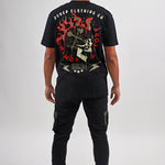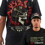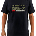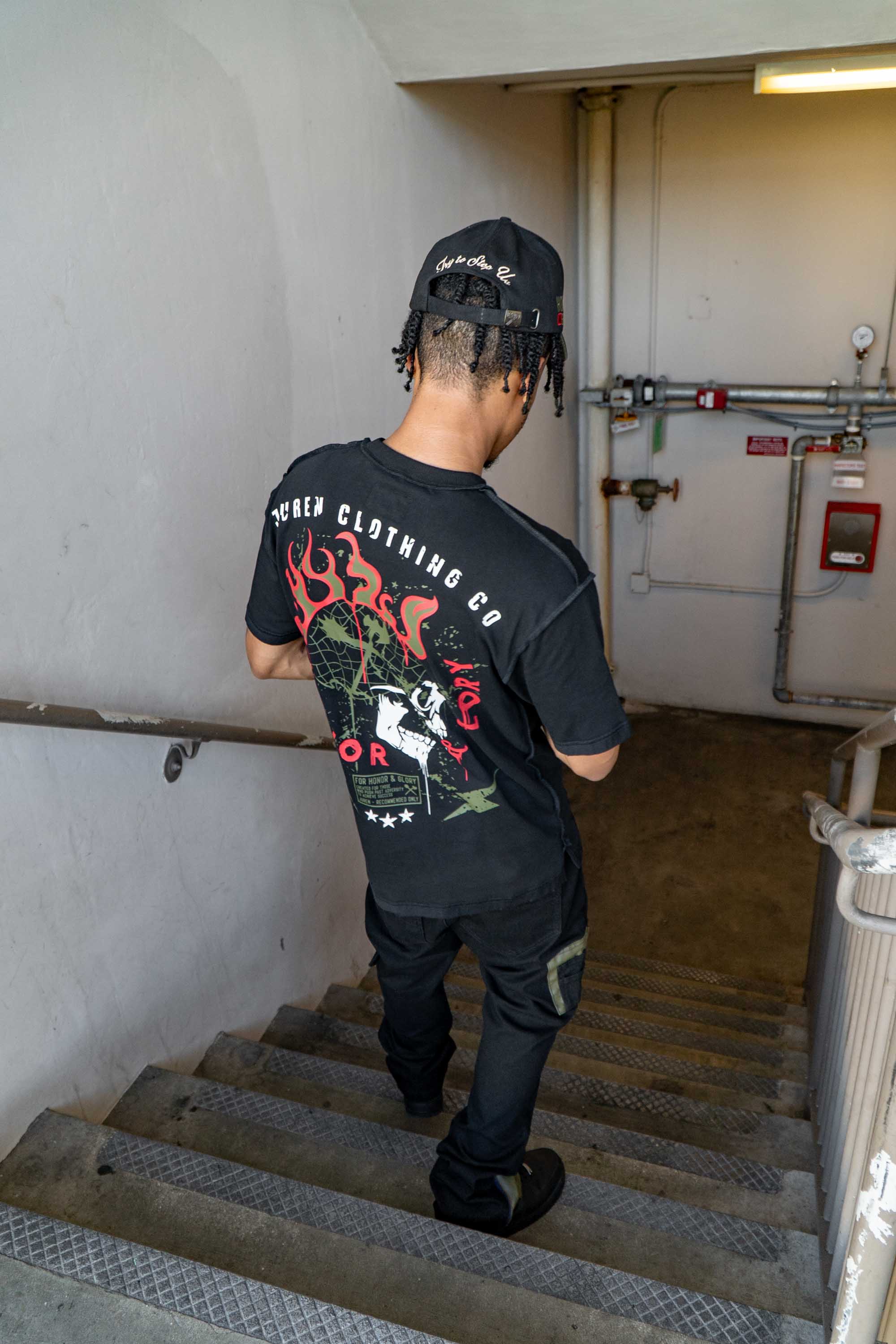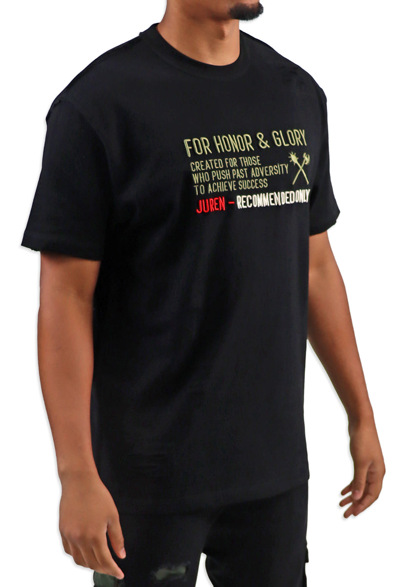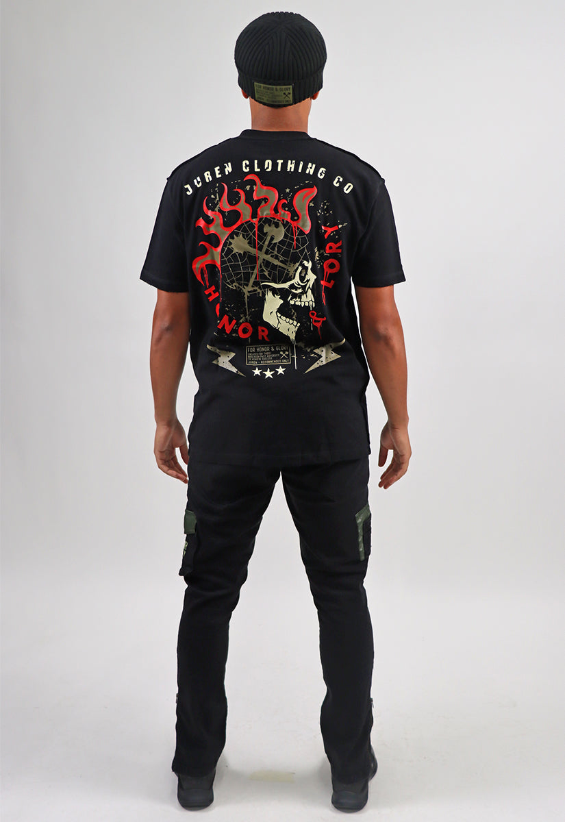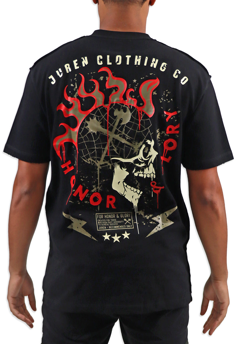 The Honor & Glory Distressed Tee brings a rugged, statement-making vibe. This black tee features distressed holes throughout, with embroidered text on the front that reads, “For Honor & Glory, created for those who push past adversity to achieve success. Juren - Recommended only,” in olive, red, and cream. A Juren logo patch accents the bottom hem. On the back, an oversized print showcases "Juren Clothing Co." with a skull in a military helmet, crossed axe and mace, and flames, circled by dripping red text that reads "Honor & Glory." Black Shirt