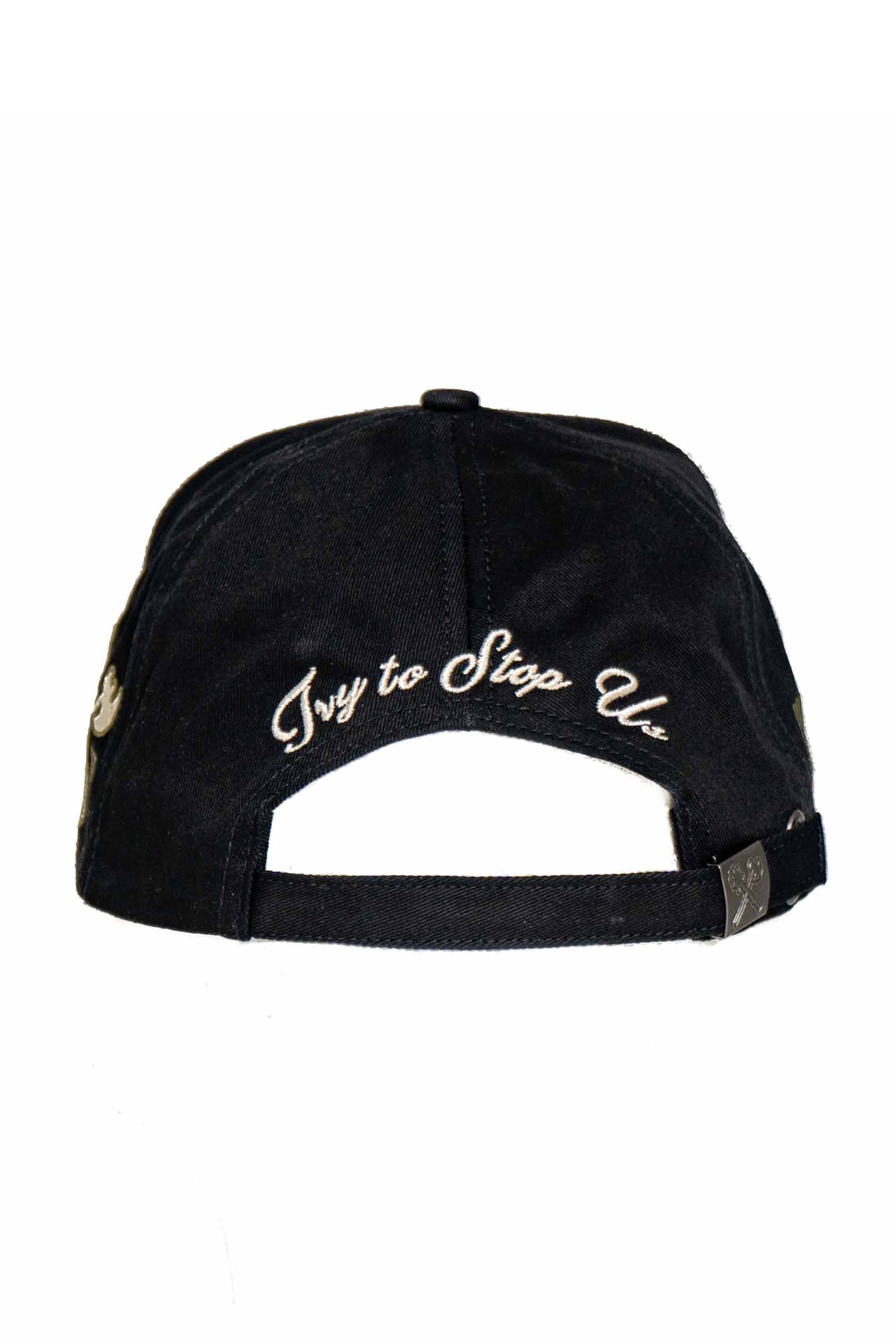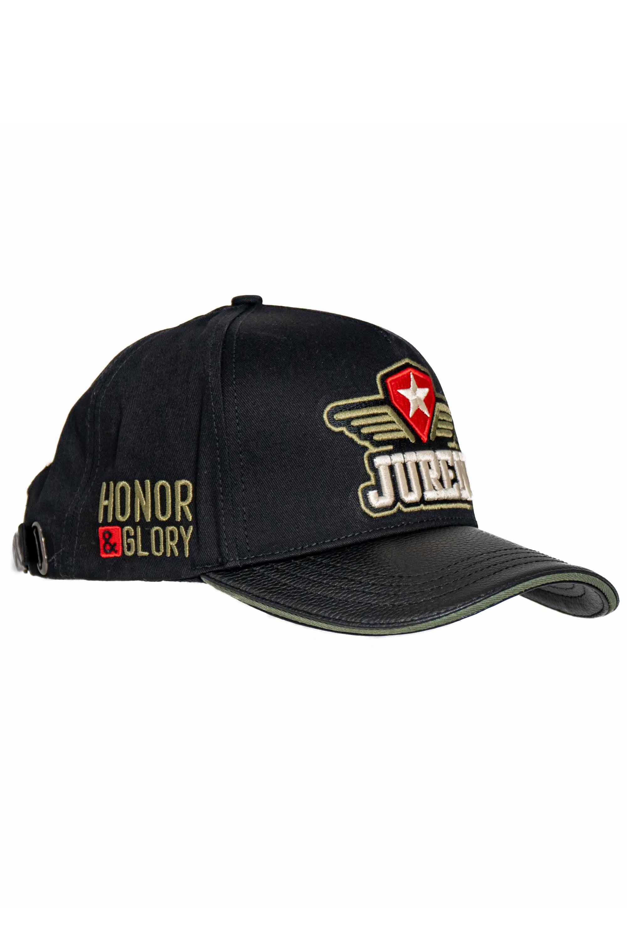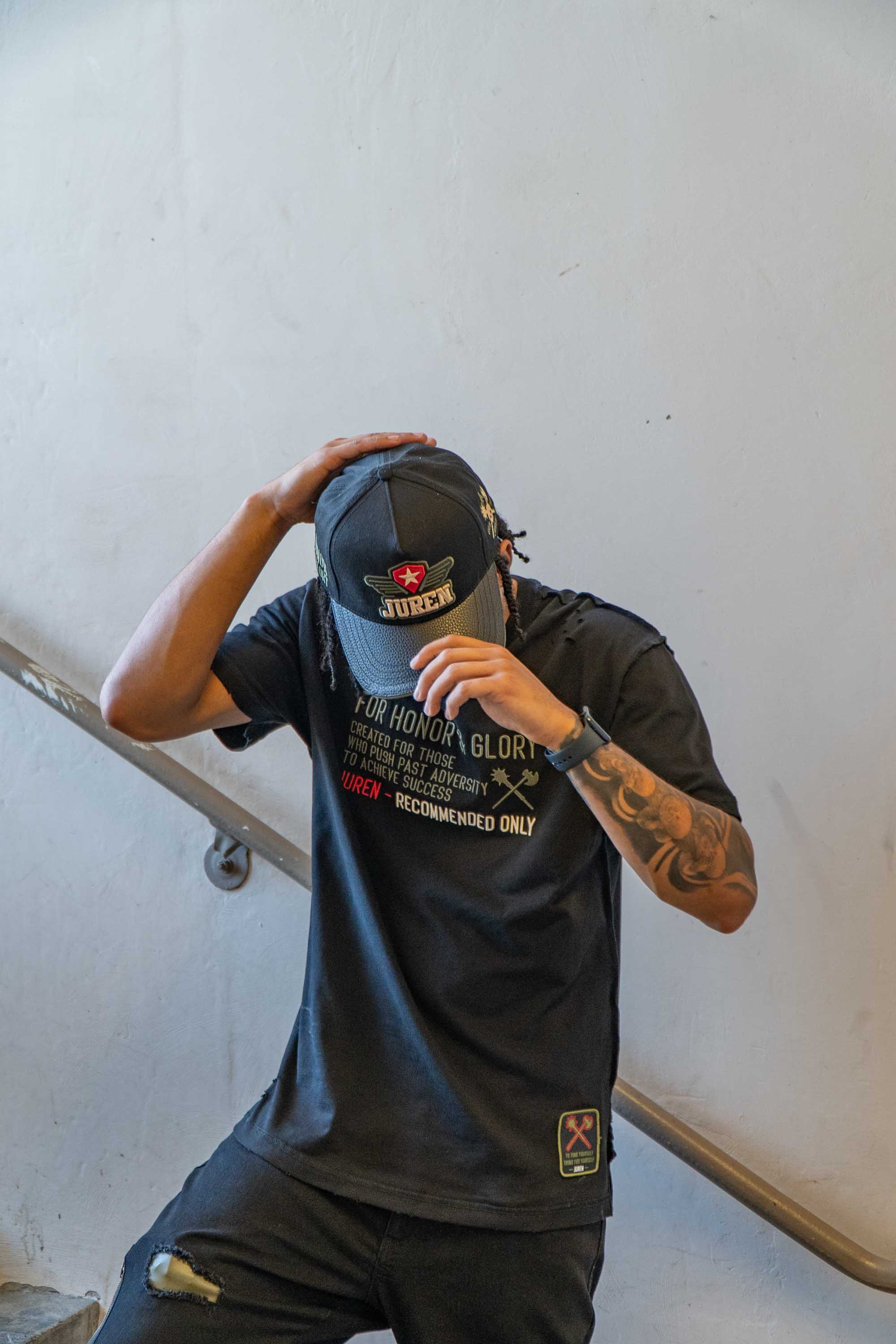 This black, military-inspired trucker hat combines bold style and grit. The front showcases “Juren” in 3D cream, olive, and red embroidery, paired with a black vegan pebble leather visor with olive ribbing. "Honor and Glory" is embroidered on the right, the Juren logo on the left, and “Try to Stop Us” in cursive cream embroidery completes the back—a statement piece for those who strive for greatness