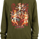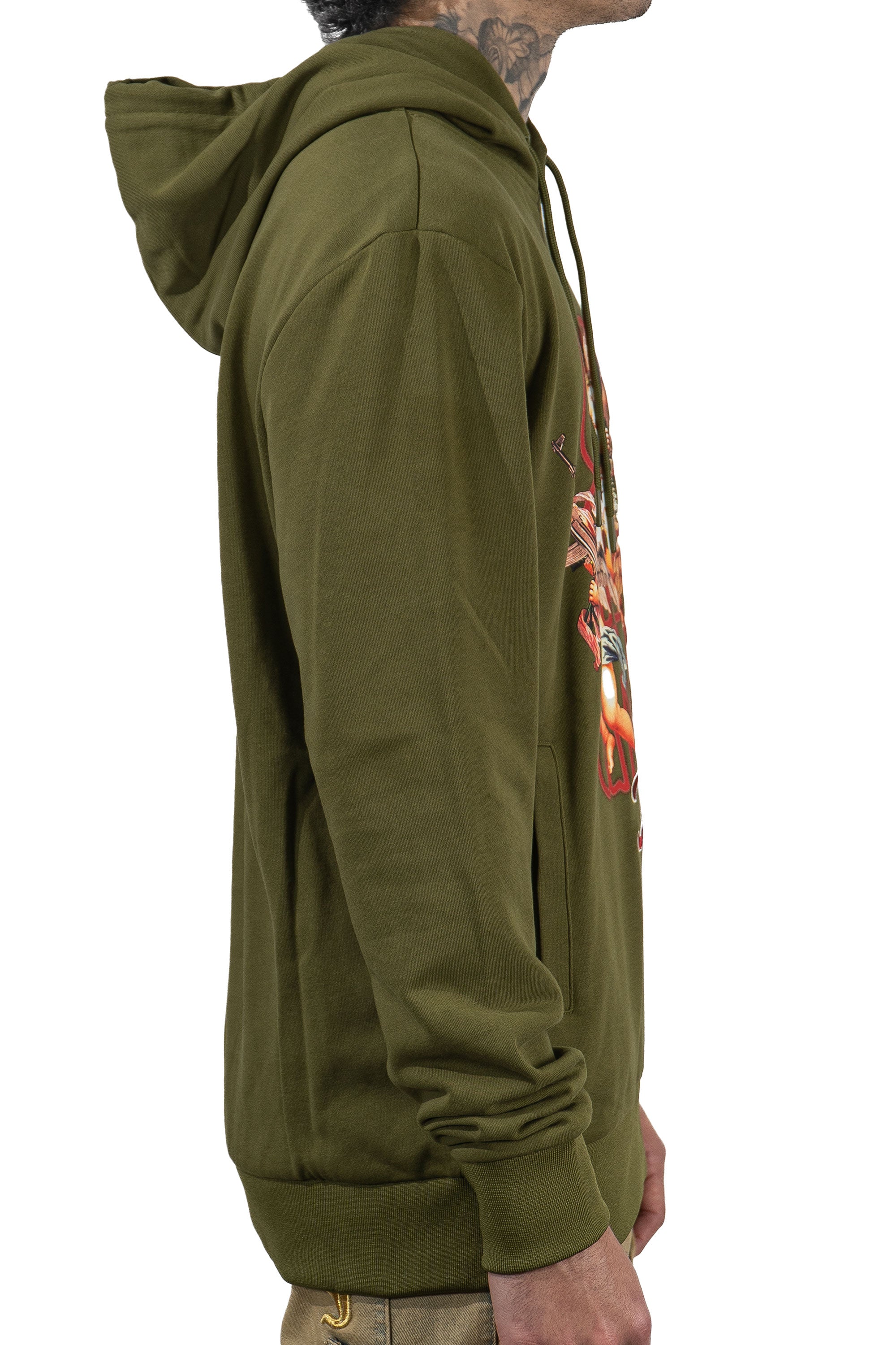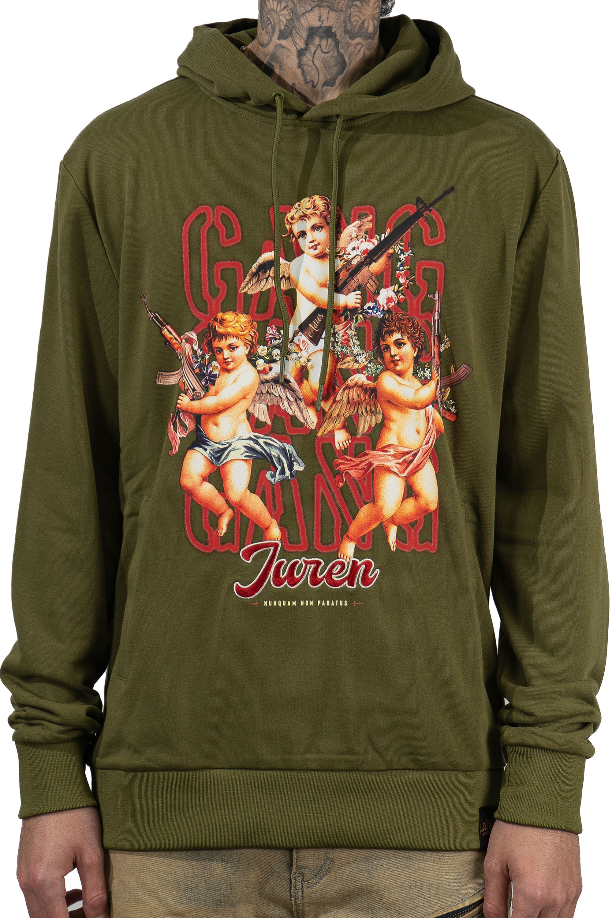The "Gang Gang Olive Pullover Hoodie" makes a striking statement with its unconventional imagery: a gang of cherubs armed with guns. Against the olive backdrop, this graphic juxtaposes innocence with rebellion, evoking a sense of intrigue and defiance. Perfect for those who appreciate bold and thought-provoking designs, wear it proudly as a symbol of unconventional style and individuality.
