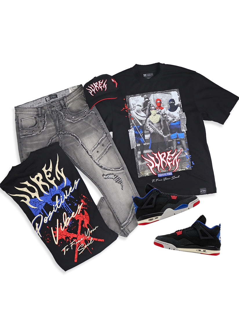 Releasing Positive Vibes Black, Grey Denim Jeans and Trucker Hat Combo (Shoes Not Included)