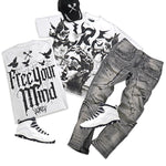 Free Your Mind White T-Shirt, Grey Denim Jeans and Leather Trucker Hat Combo Include: