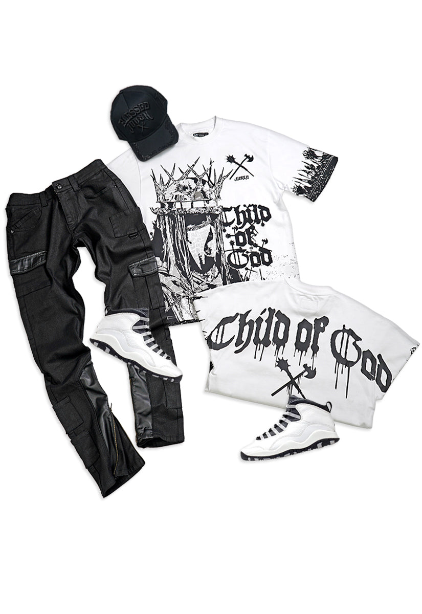 Child of God White T-Shirt, Black Denim Jeans and Leather Trucker Hat Combo Include: