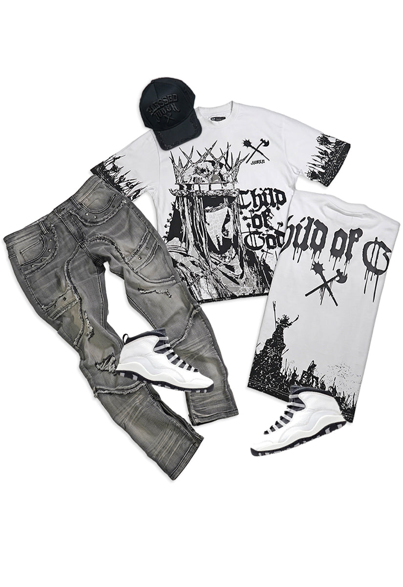 Child of God White T-Shirt, Grey Denim Jeans and Leather Trucker Hat Combo Include: