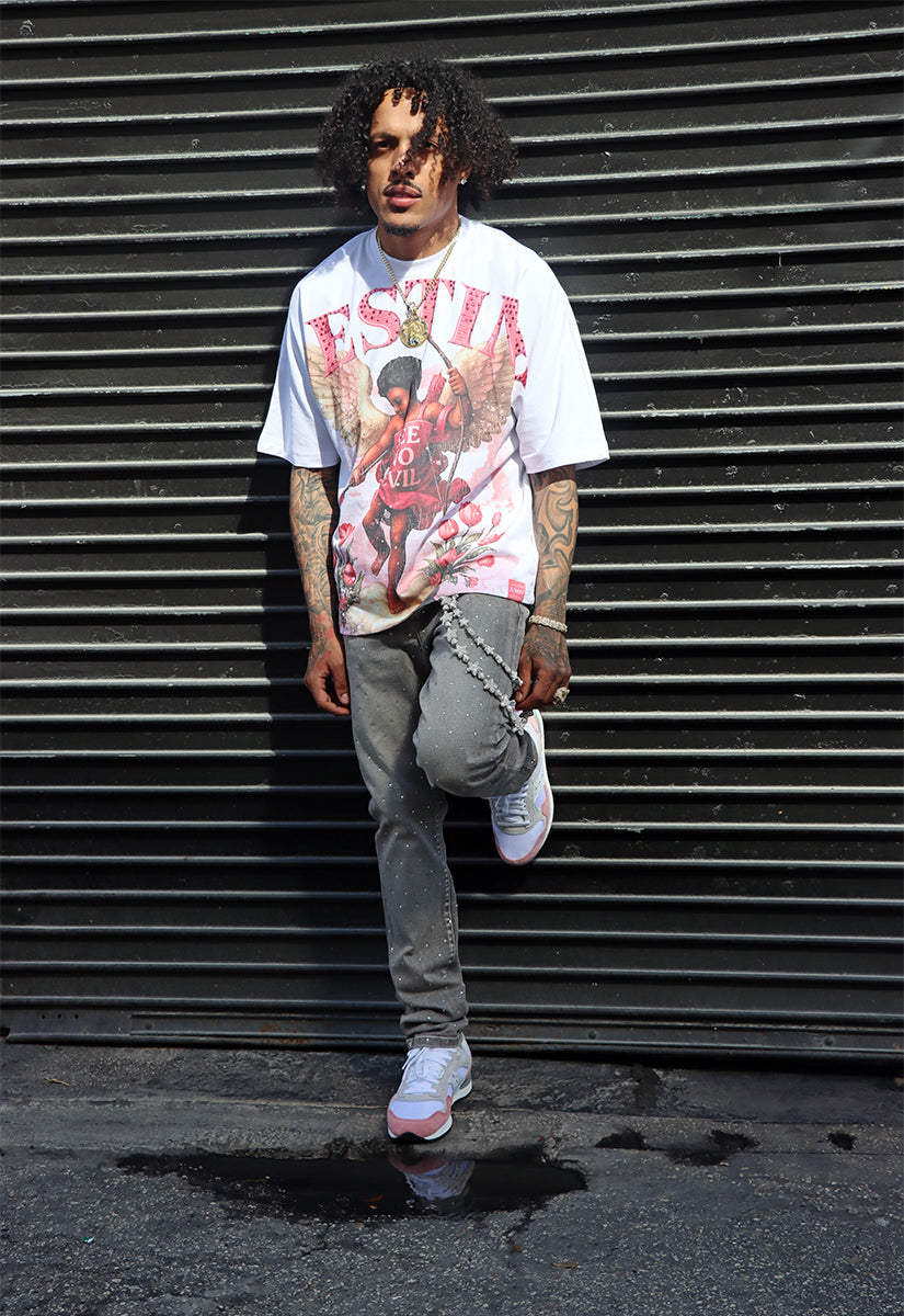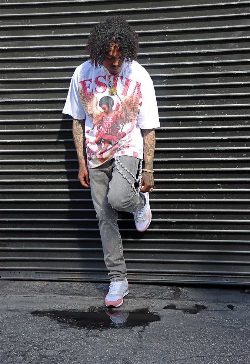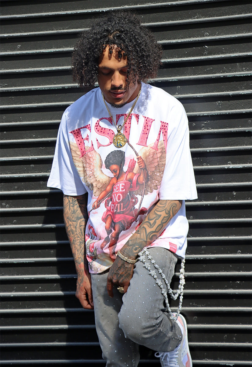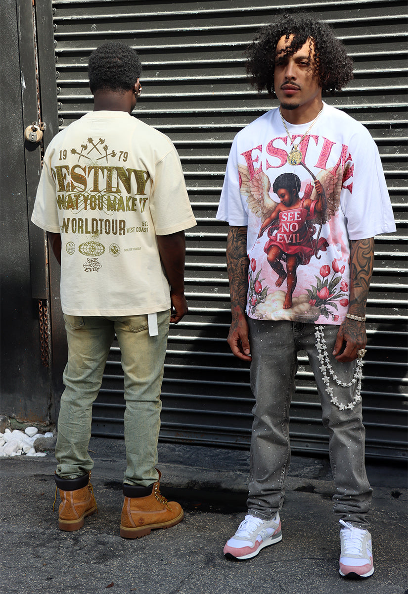The Destiny White Shirt delivers sophisticated style through carefully curated graphic placement and luxe embellishment. Crafted in a premium white fabric, the front showcases a commanding angel motif paired with the contemplative "See No Evil" inscription. The word "DESTINY" in pink dominates the upper front with pink rhinestones, creating a striking focal point that catches and reflects light with every movement. The rhinestone detailing is concentrated exclusively on the front, allowing the embellishments to command attention without overwhelming the design. The back features a bold 1979 Battle Axe graphic alongside the inspirational text "Destiny Is What You Make It," rendered in clean, unadorned print for balanced visual contrast. This strategic design approach—combining rhinestone luxury on the front with understated graphics on the back—creates a versatile piece that works equally well as a statement layer or standalone garment. The quality construction ensures durability and longevity, making this shirt a meaningful addition to any wardrobe that celebrates personal empowerment and artistic expression.