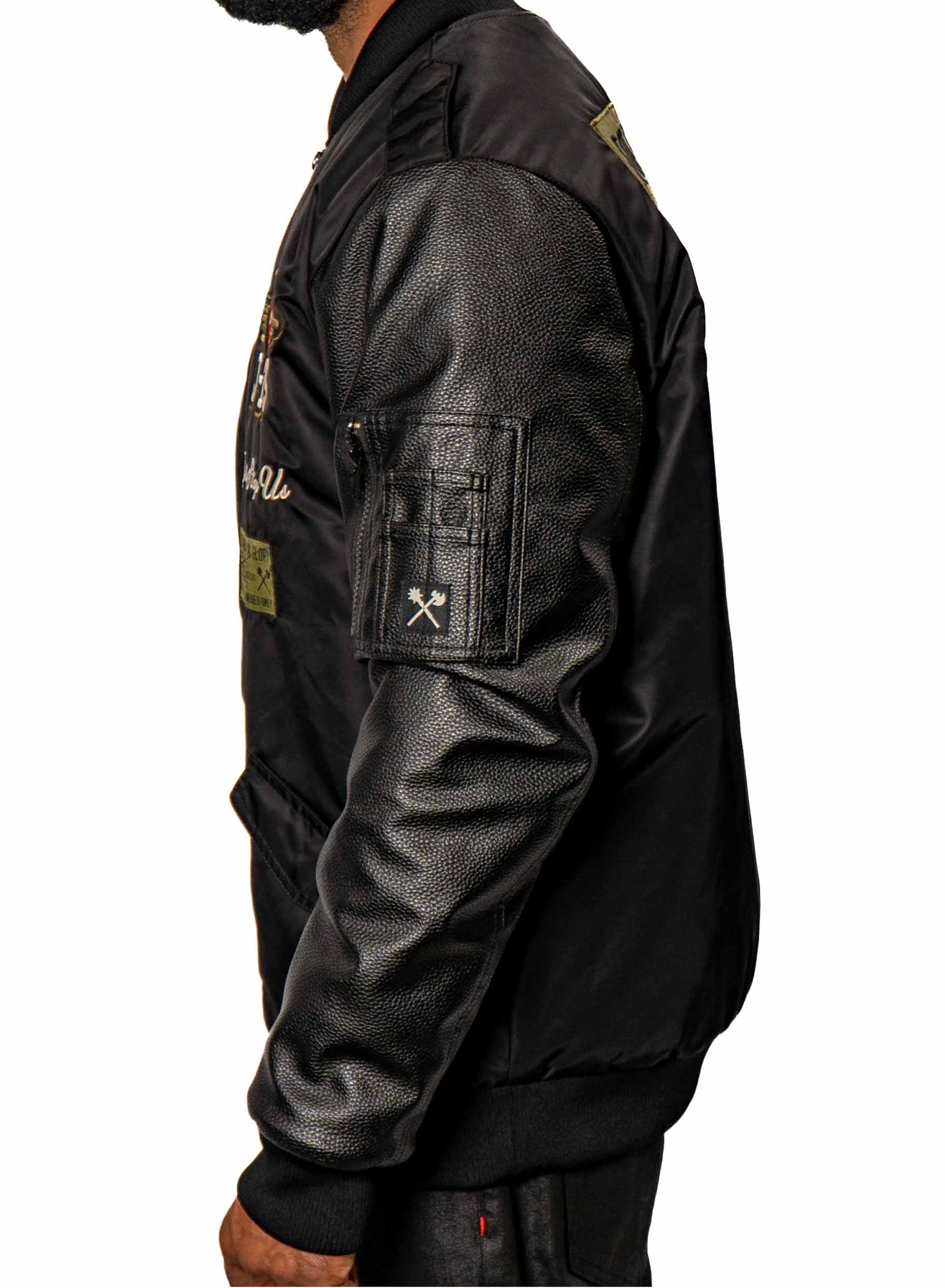 Honor & Glory Bomber Jacket is a bold piece that blends classic and modern elements. Crafted from black nylon with black vegan pebble leather sleeves, this jacket features multiple embroidered patches on the front, including "Honor and Glory" and "Try to Stop Us." A utility pocket on the left sleeve adds functionality.