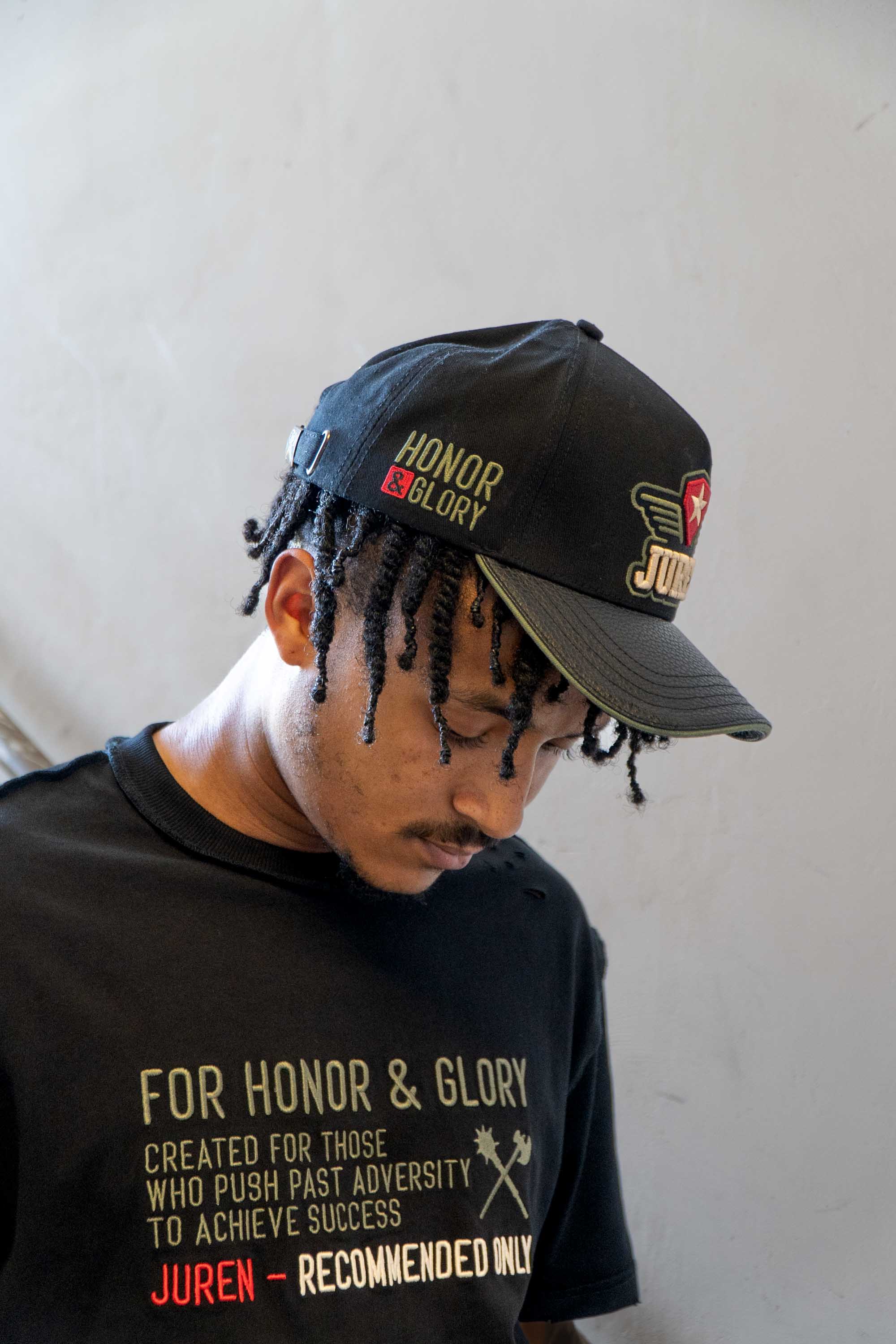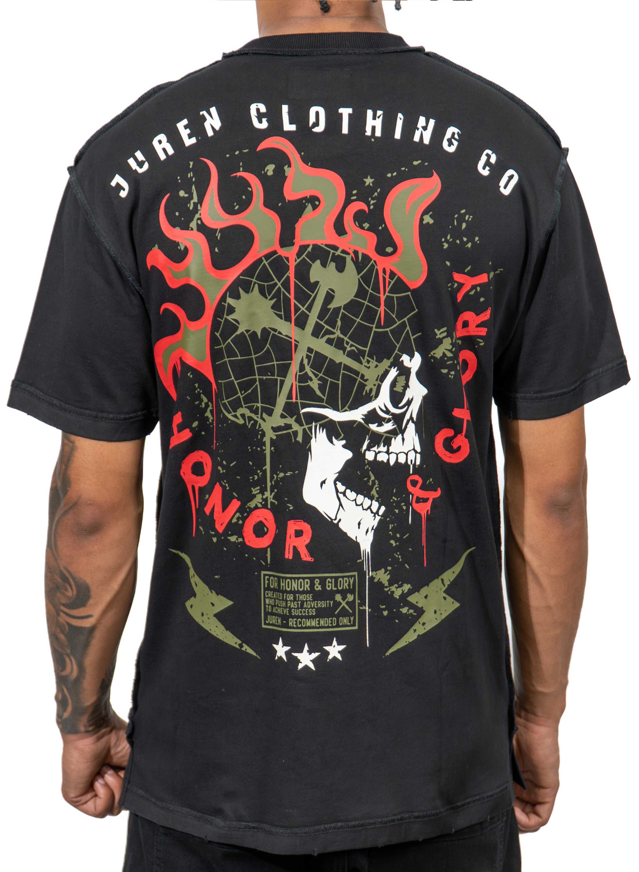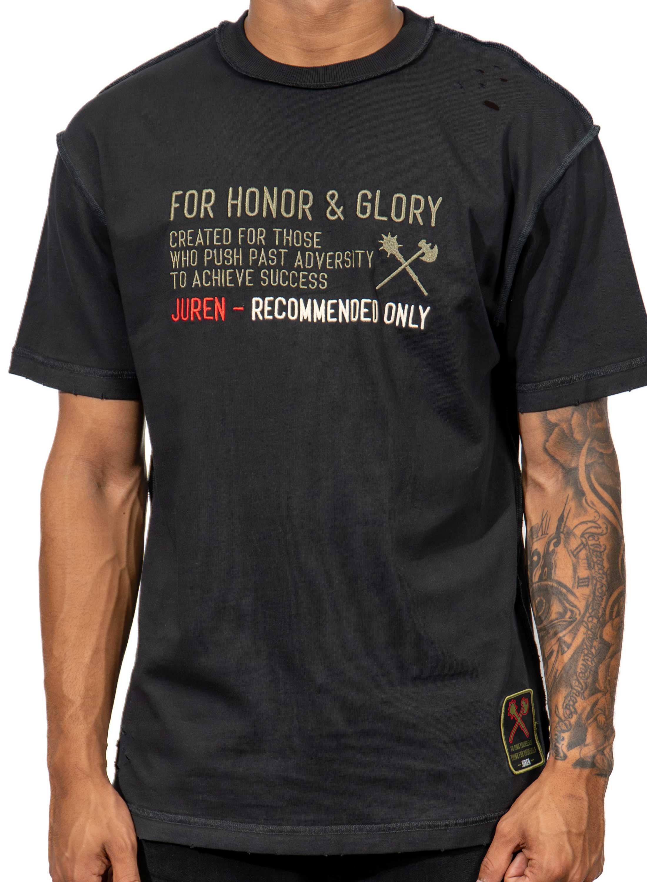The Honor & Glory Distressed Tee brings a rugged, statement-making vibe. This black tee features distressed holes throughout, with embroidered text on the front that reads, “For Honor & Glory, created for those who push past adversity to achieve success. Juren - Recommended only,” in olive, red, and cream. A Juren logo patch accents the bottom hem. On the back, an oversized print showcases "Juren Clothing Co." with a skull in a military helmet, crossed axe and mace, and flames, circled by dripping red text that reads "Honor & Glory."