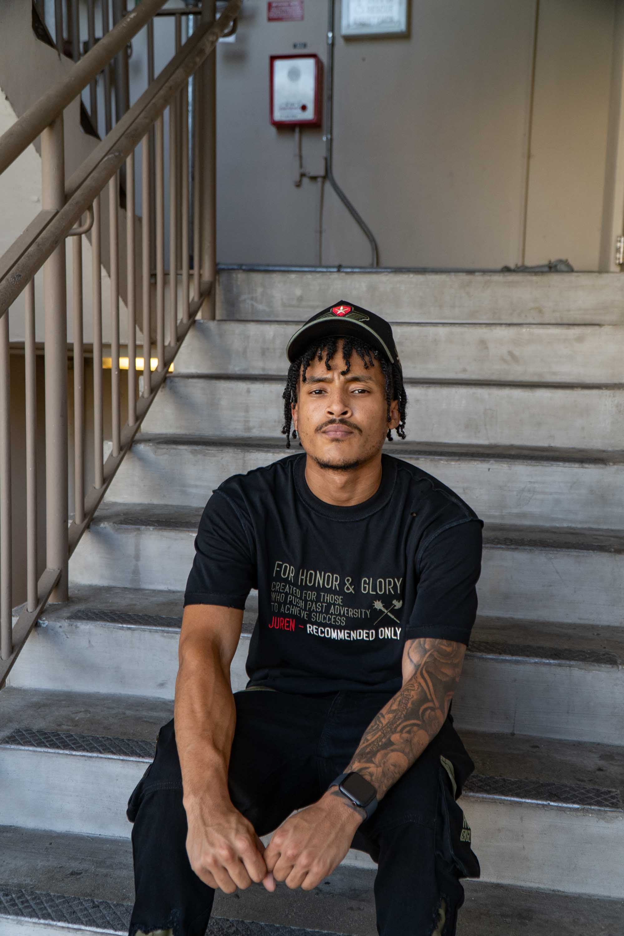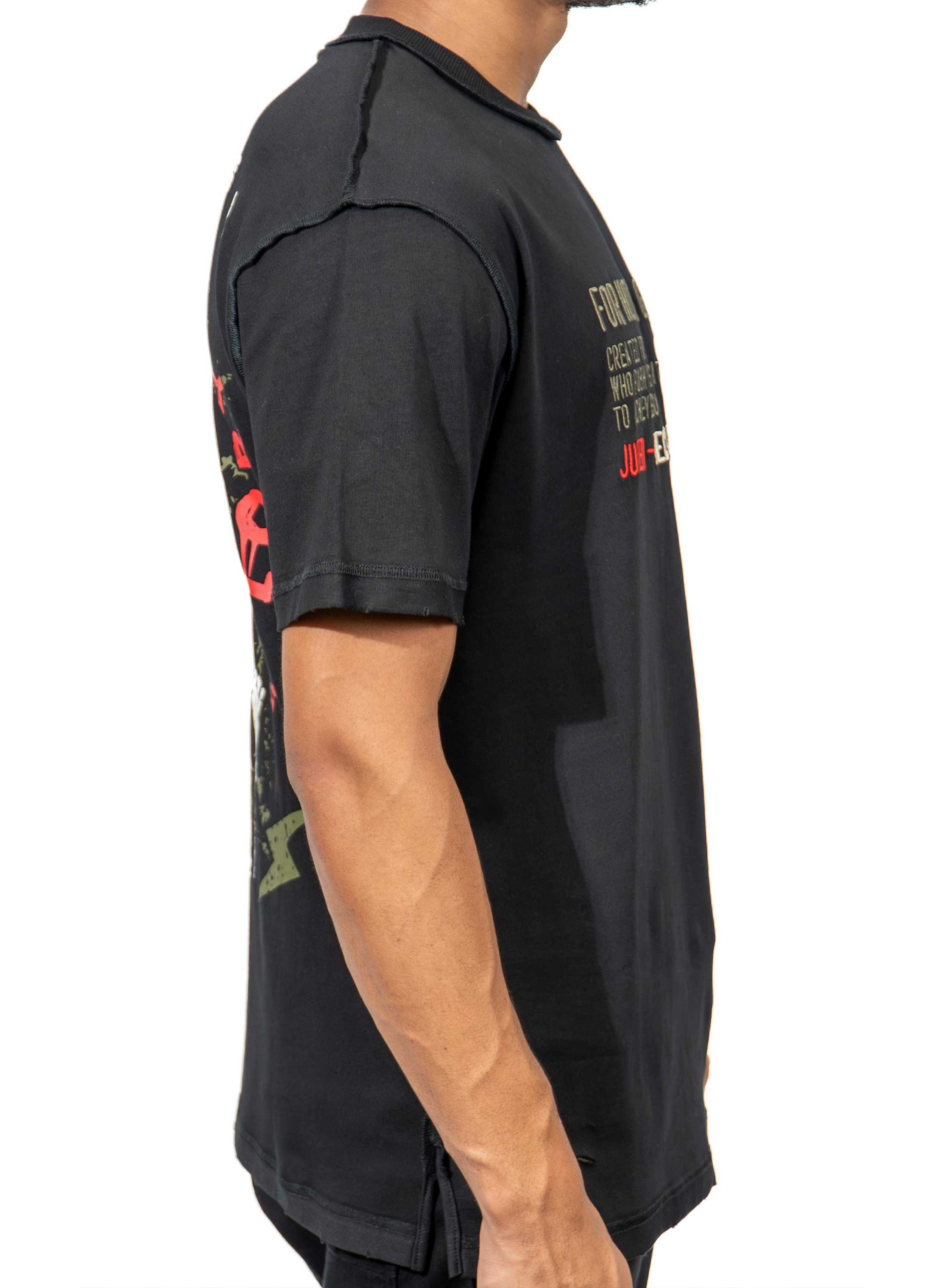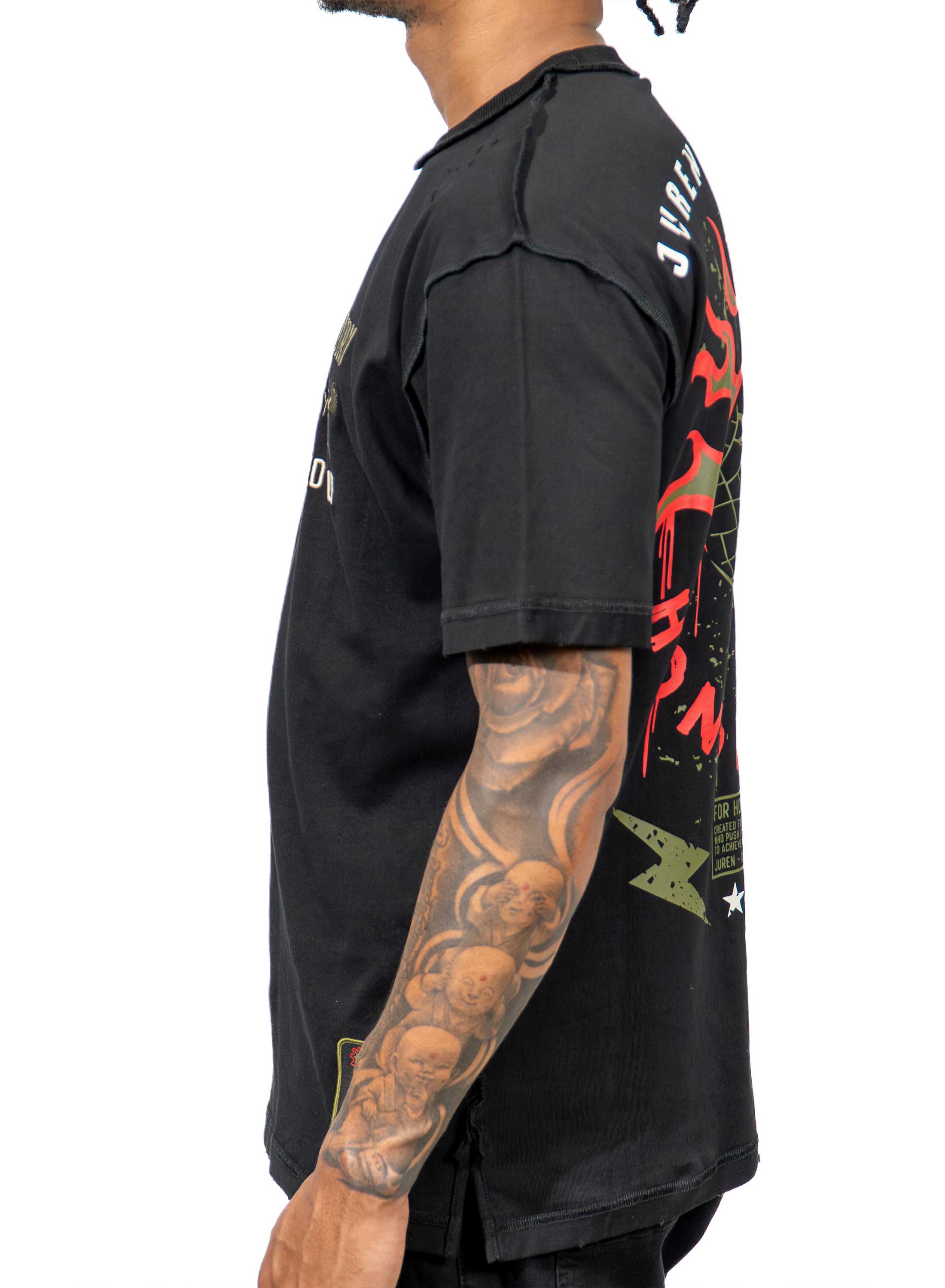 The Honor & Glory Distressed Tee brings a rugged, statement-making vibe. This black tee features distressed holes throughout, with embroidered text on the front that reads, “For Honor & Glory, created for those who push past adversity to achieve success. Juren - Recommended only,” in olive, red, and cream. A Juren logo patch accents the bottom hem. On the back, an oversized print showcases "Juren Clothing Co." with a skull in a military helmet, crossed axe and mace, and flames, circled by dripping red text that reads "Honor & Glory."