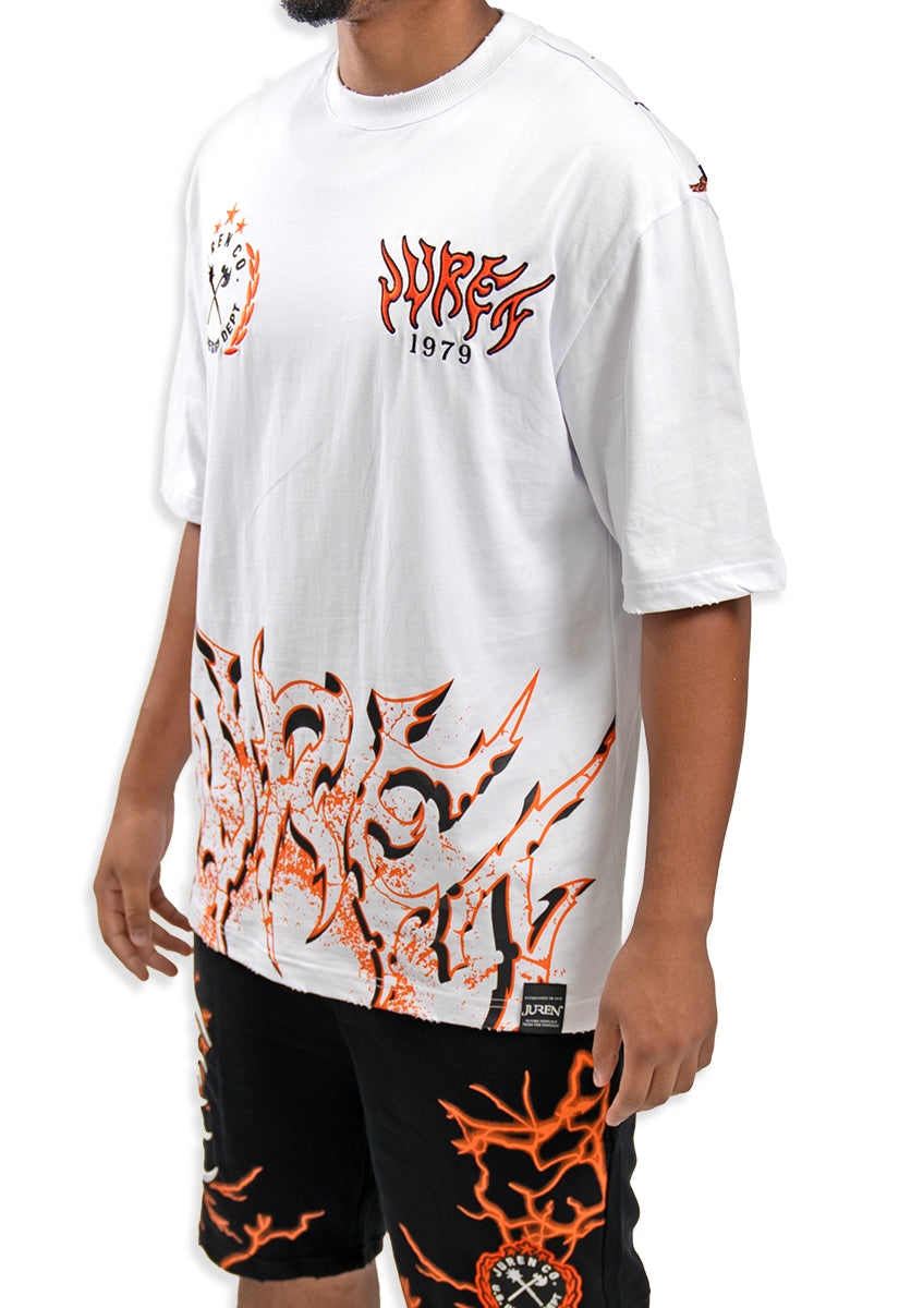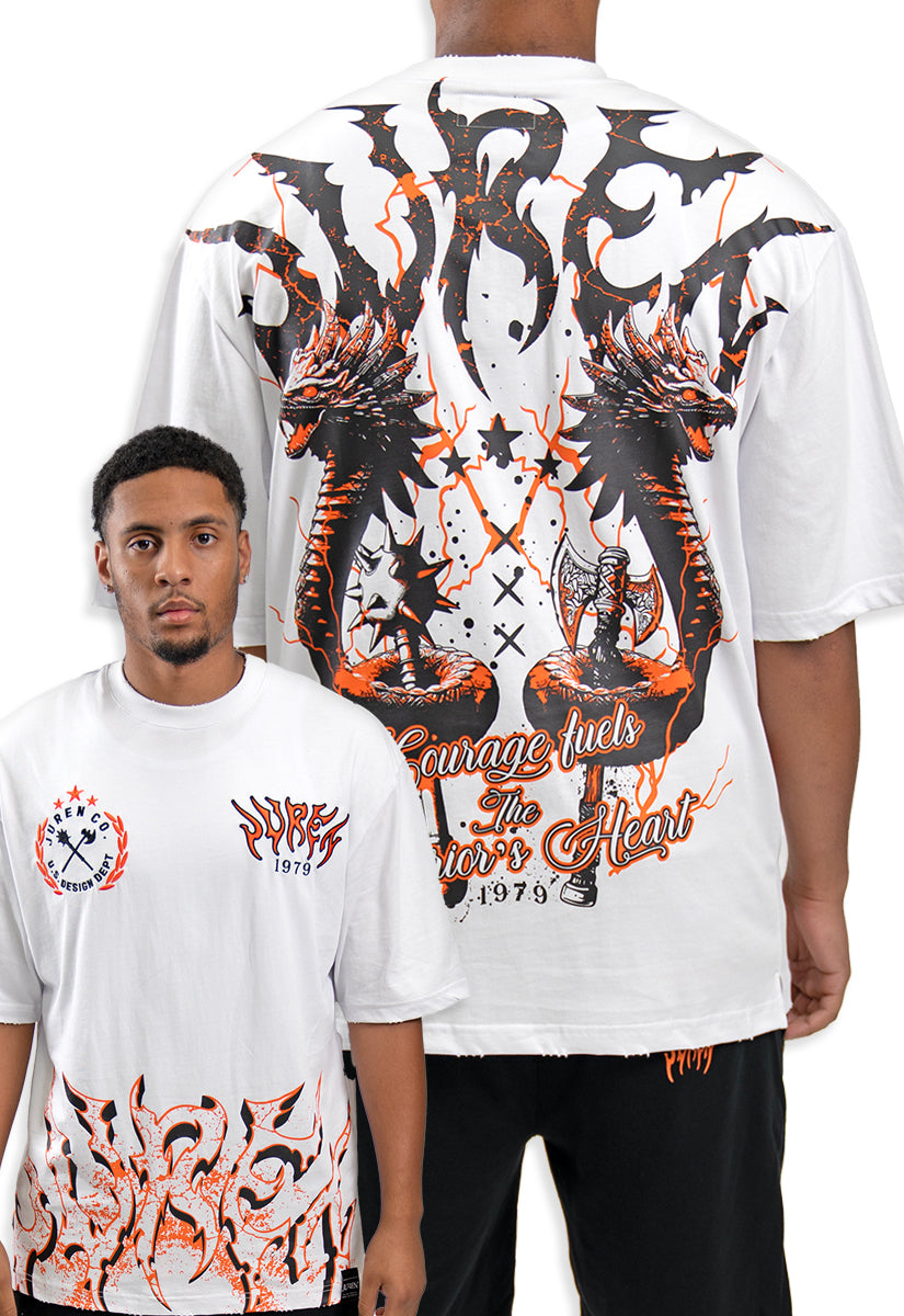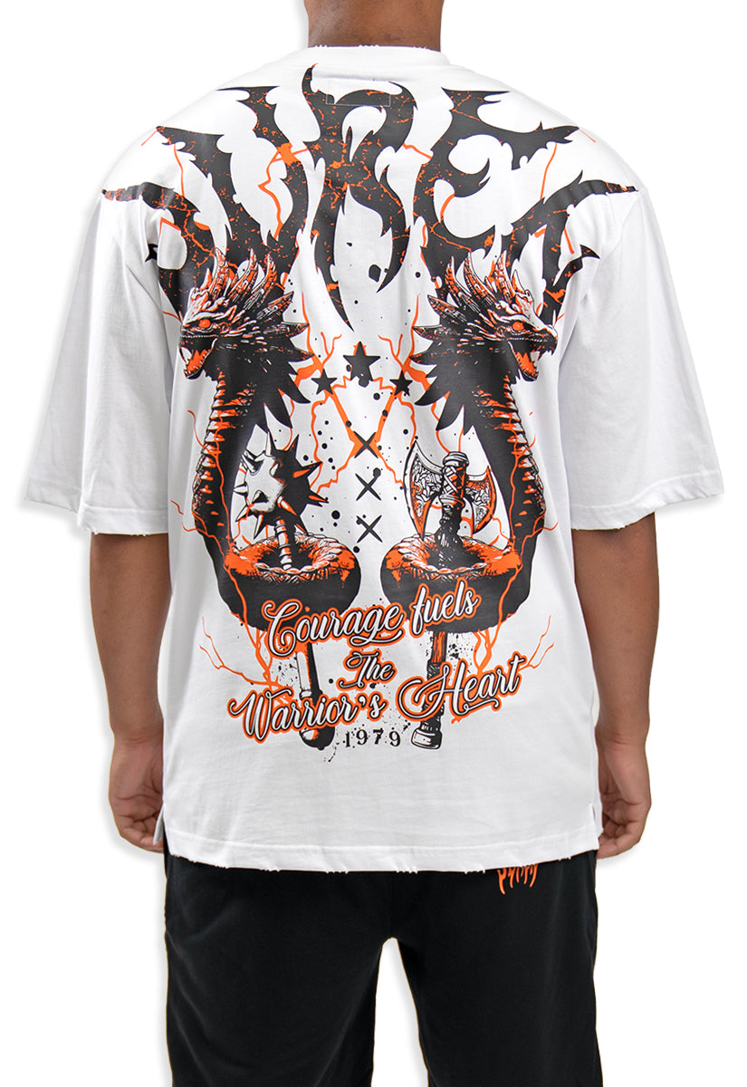 The Warrior Heart T-Shirt in white features a bold, oversized design that commands attention. The front showcases the Juren logo in large lettering, emerging from the bottom with striking orange and black outlines that add depth and vibrancy. On the back, two intricately detailed dragons create a powerful visual statement, complemented by another prominent Juren logo at the top. Crafted for those who appreciate standout streetwear, this tee combines artistic flair with a comfortable fit, making it a versatile addition to any wardrobe. Perfect for expressing strength and style with confidence.