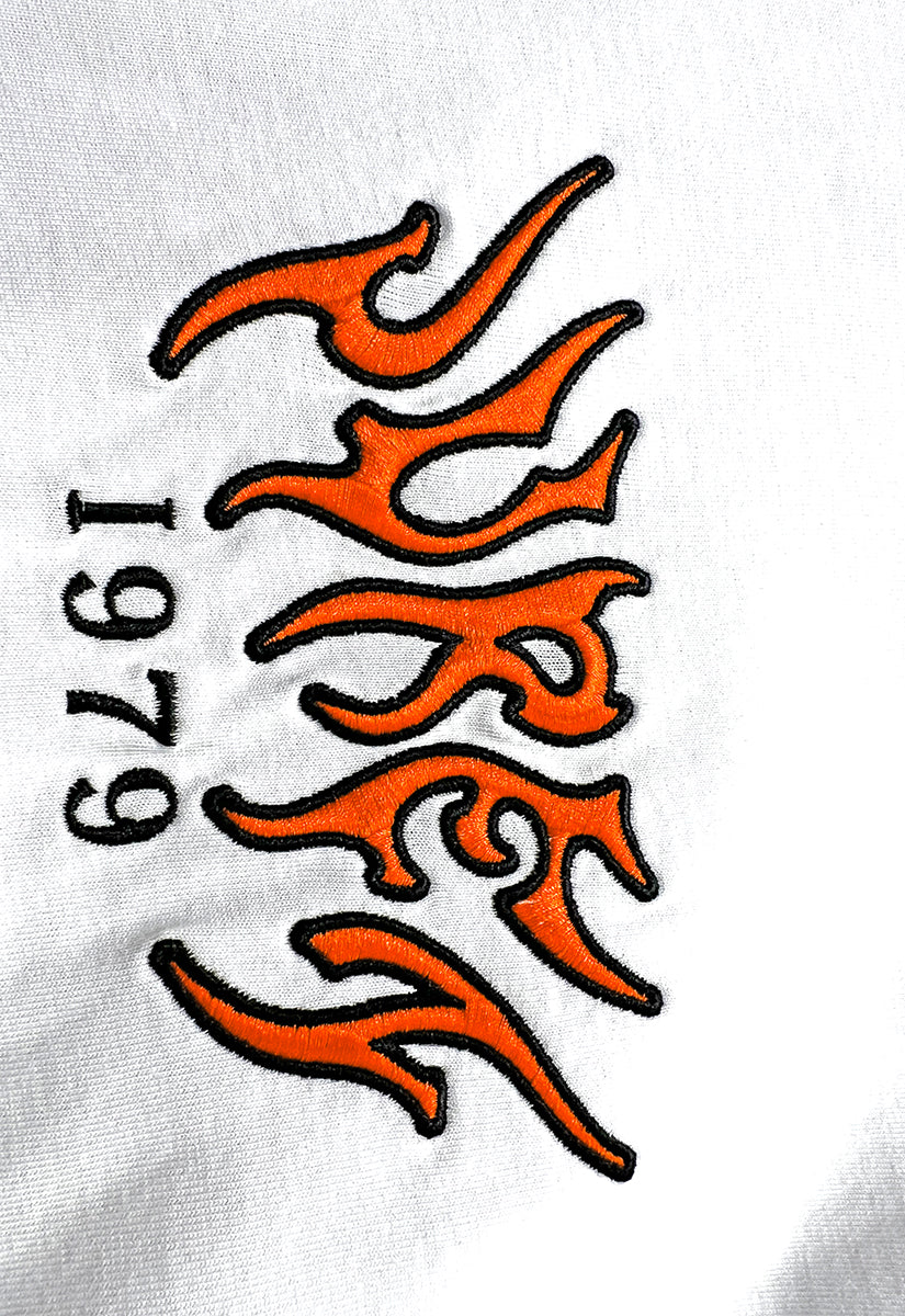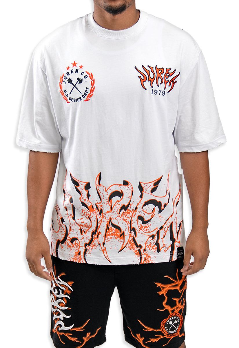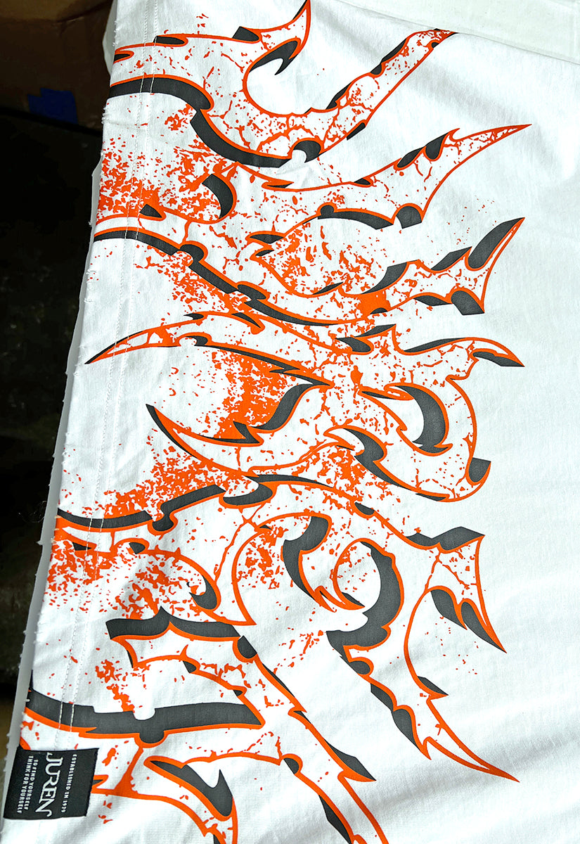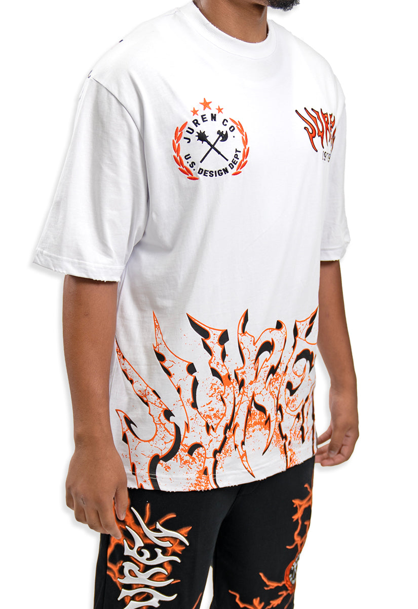 The Warrior Heart T-Shirt in white features a bold, oversized design that commands attention. The front showcases the Juren logo in large lettering, emerging from the bottom with striking orange and black outlines that add depth and vibrancy. On the back, two intricately detailed dragons create a powerful visual statement, complemented by another prominent Juren logo at the top. Crafted for those who appreciate standout streetwear, this tee combines artistic flair with a comfortable fit, making it a versatile addition to any wardrobe. Perfect for expressing strength and style with confidence.