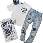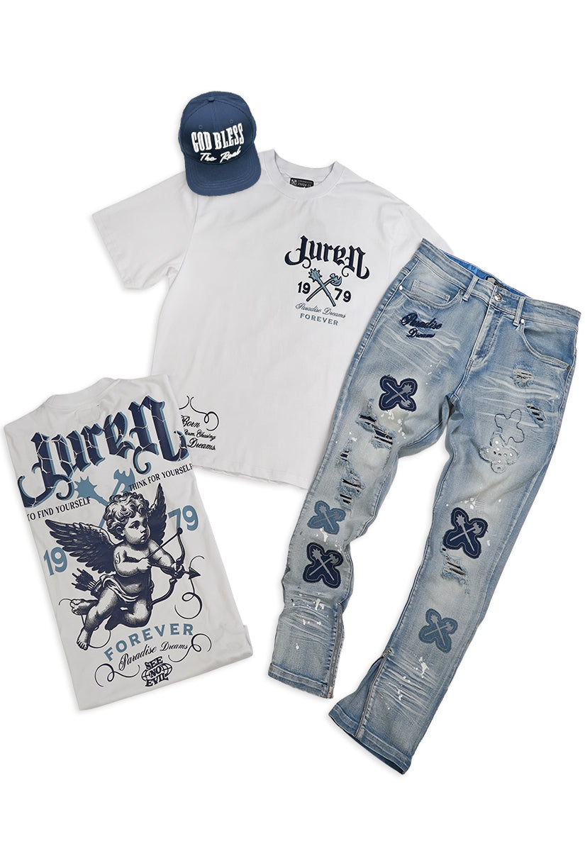 Paradise Dream White Shirt, Denim Jeans and God Bless Navy Hat Combo