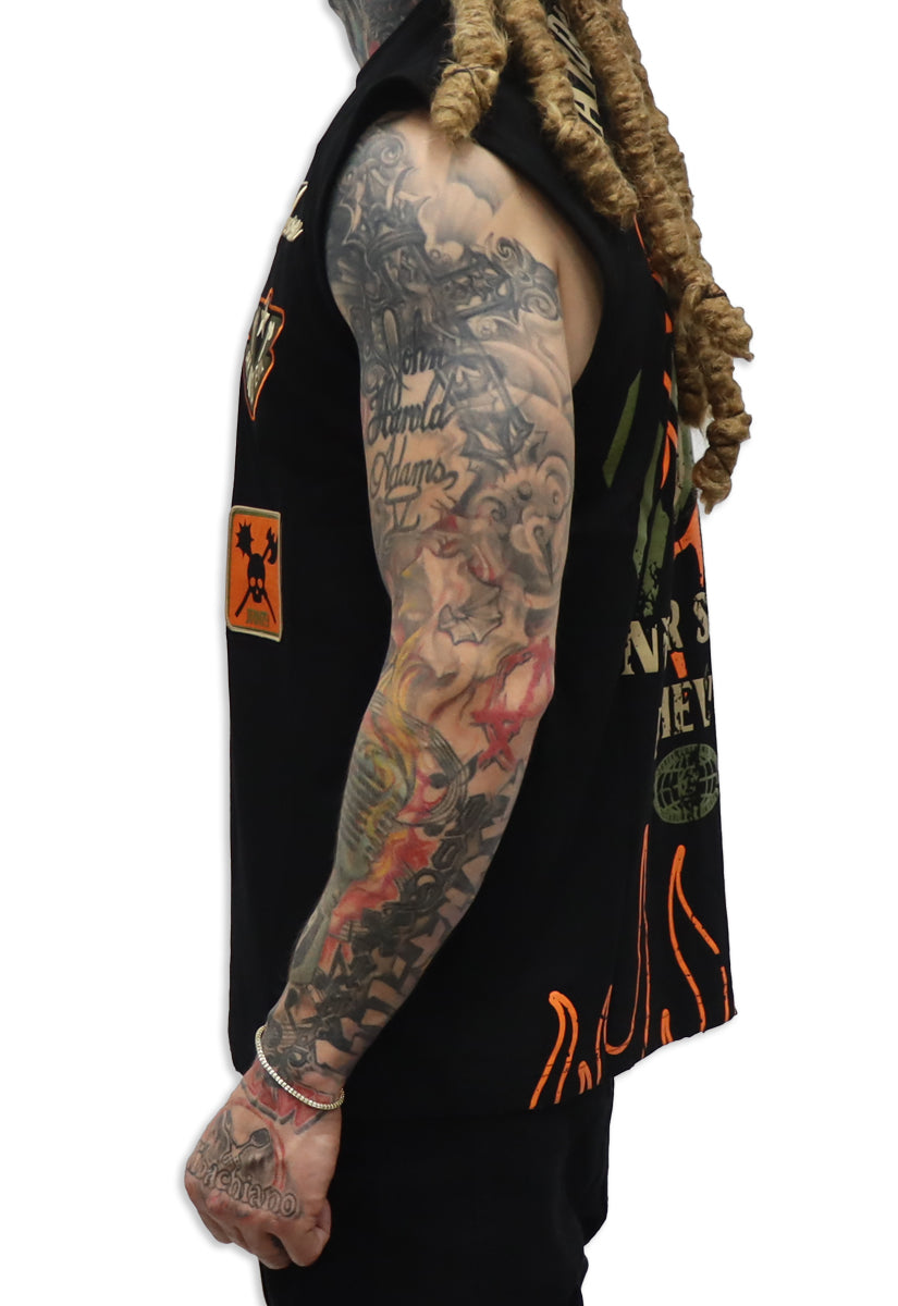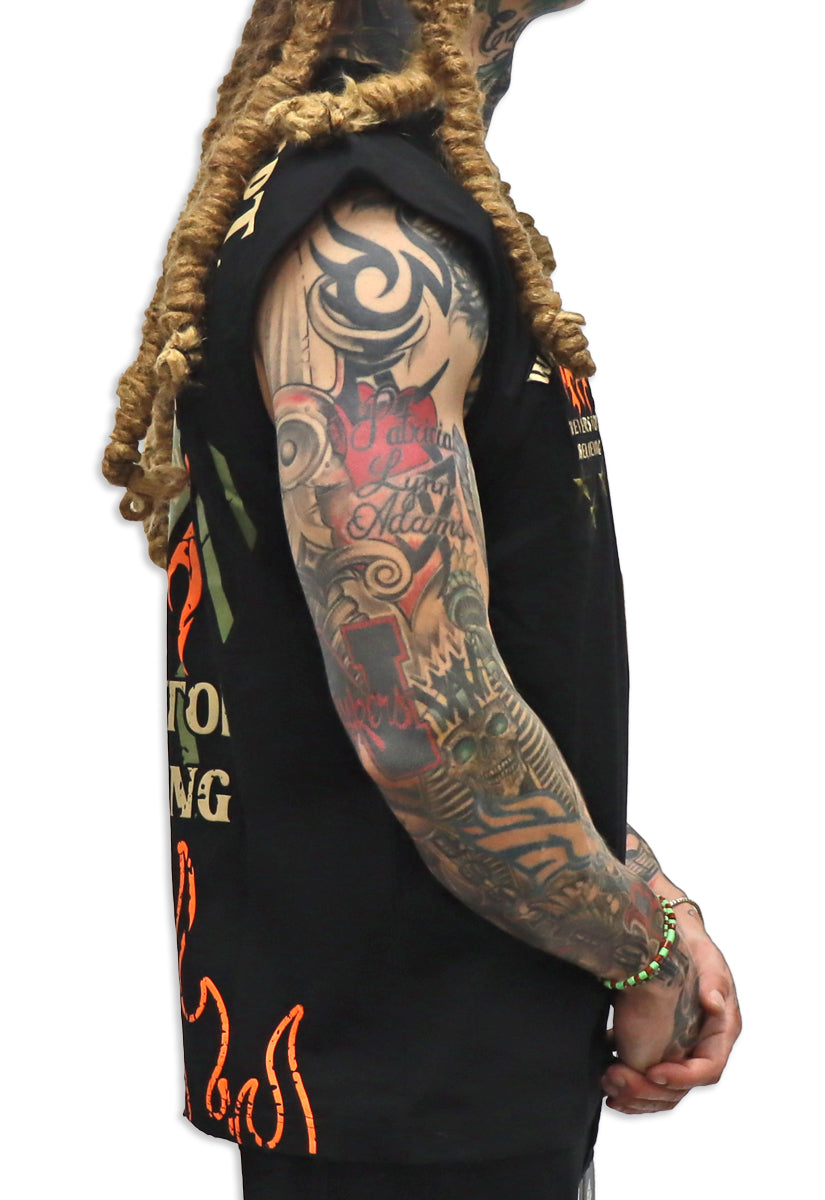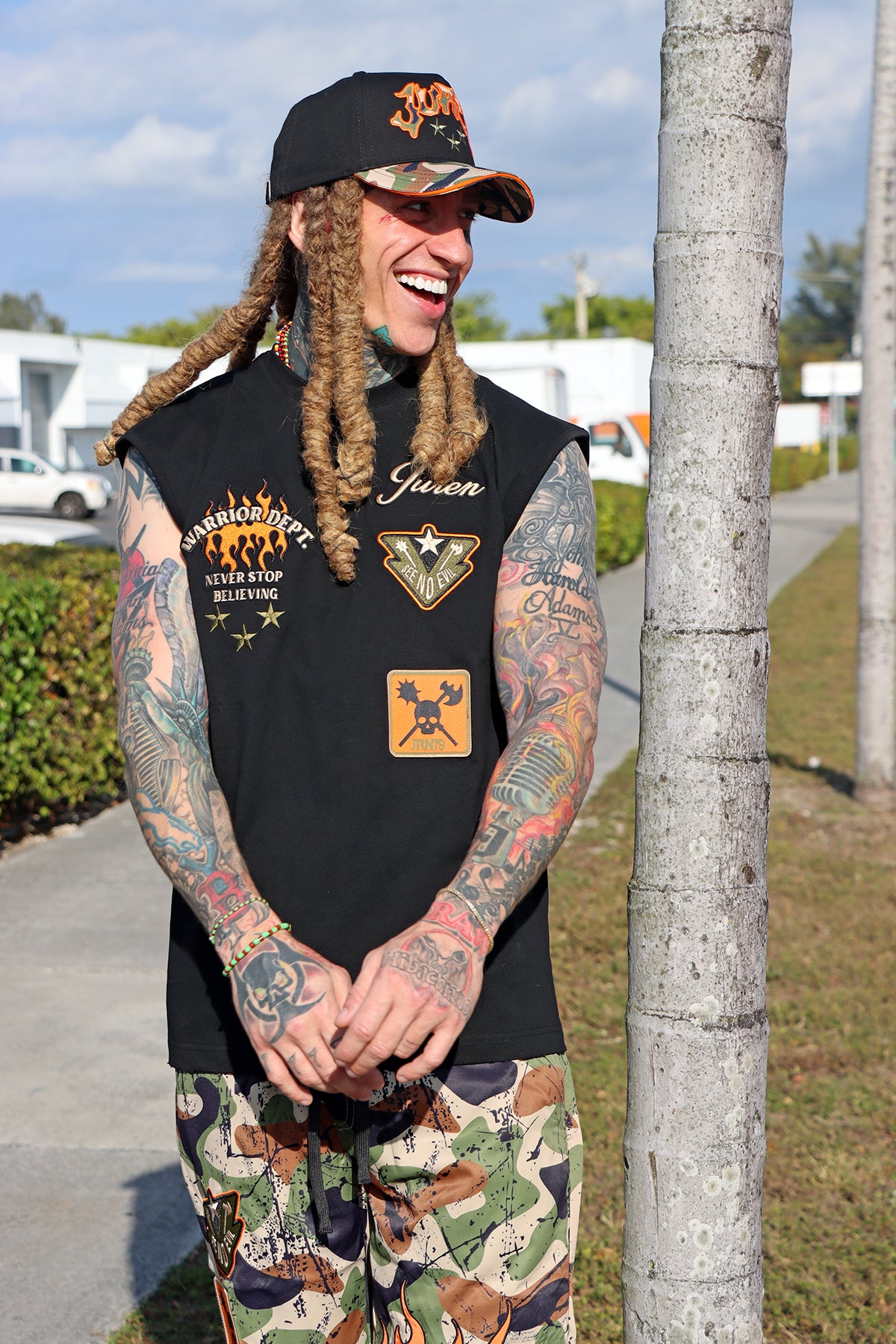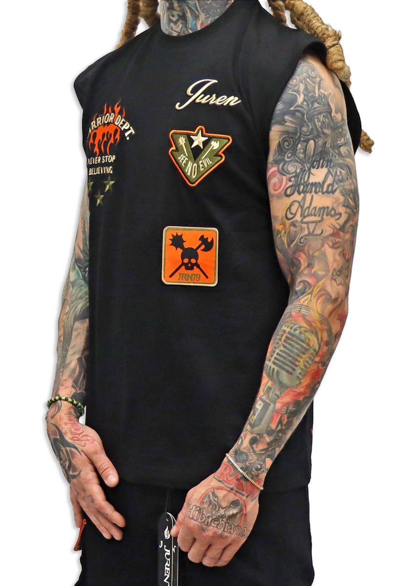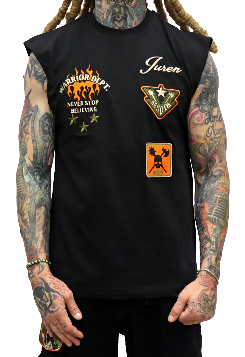 Designed for the bold and built for the grind, the Warrior Dept. Muscle Tee by Juren brings tactical edge to your rotation. Crafted from heavyweight 230gsm 100% cotton, this piece features finished arm hems for a clean, athletic look. The front hits include multiple embroidered patches, while the oversized puff print graphic on the back carries the "See No Evil" emblem and "Never Stop Believing" motto. Distressed details throughout add character without compromising structure.