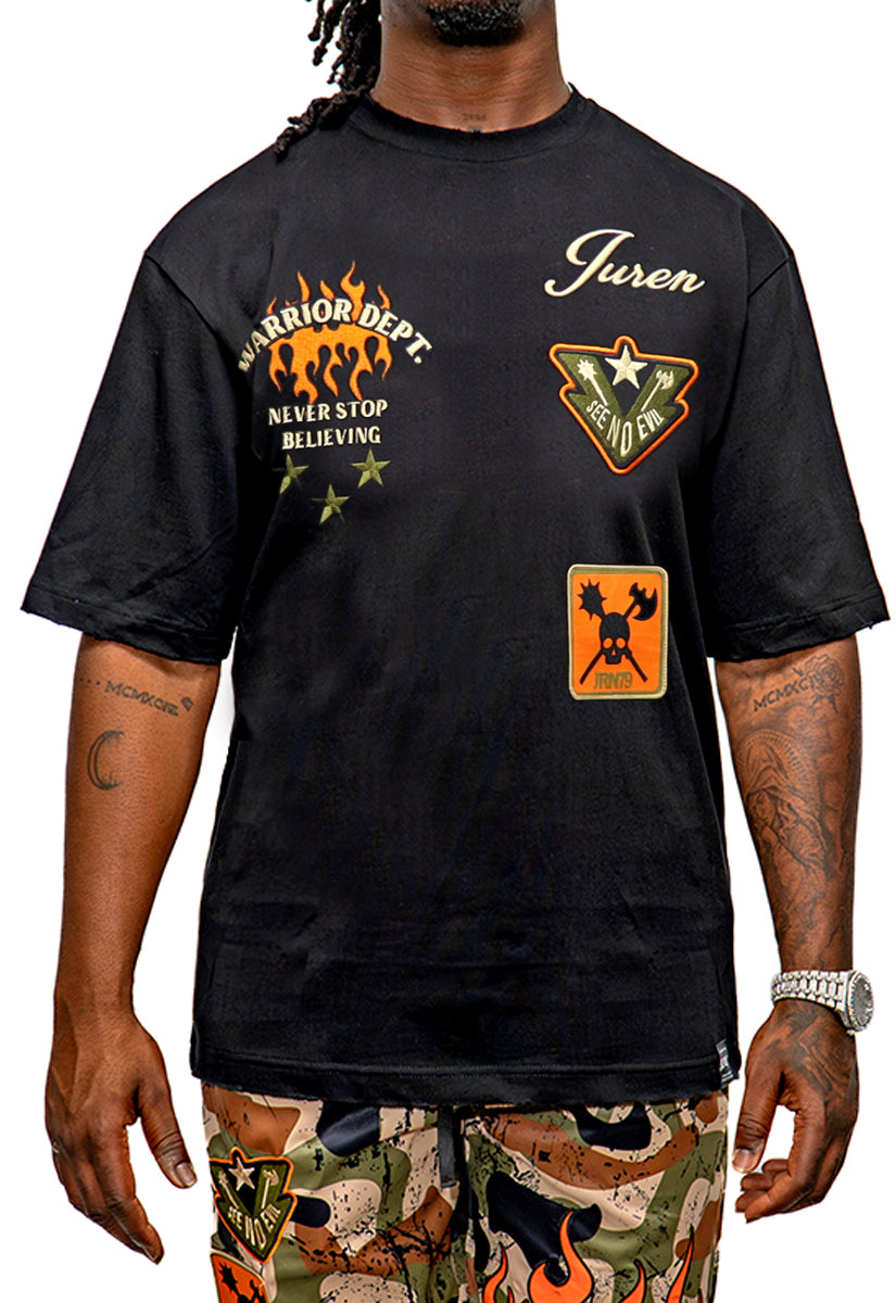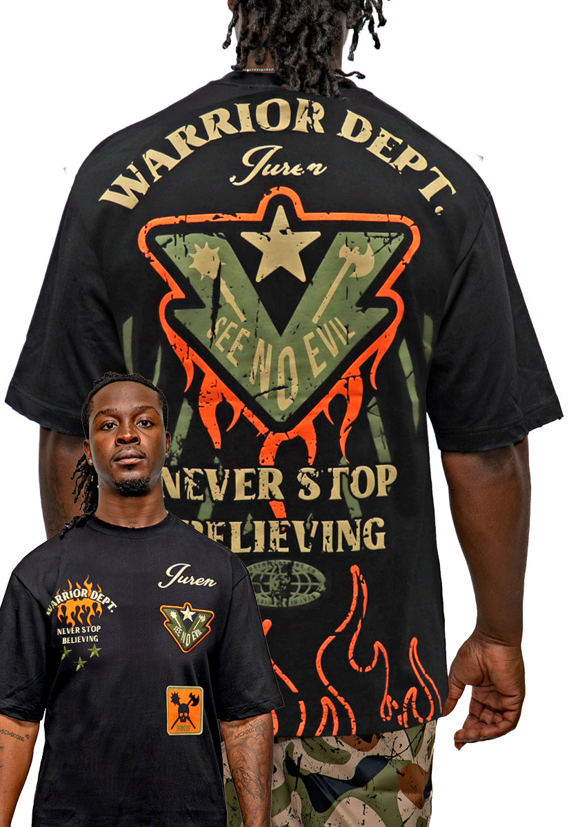 Built for warriors, not followers. This tee is crafted from heavyweight 230gsm 100% cotton with a superior fit that stands the test of time. Featuring multiple embroidered chest patches, an oversized puff print graphic on the back, and light distressing throughout for a rugged, lived-in look. The "See No Evil" emblem and "Never Stop Believing" motto fuel the spirit behind this standout piece.