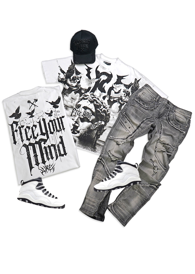 Free Your Mind White T-Shirt, Grey Denim Jeans and Leather Trucker Hat Combo (Shoes Not Included)